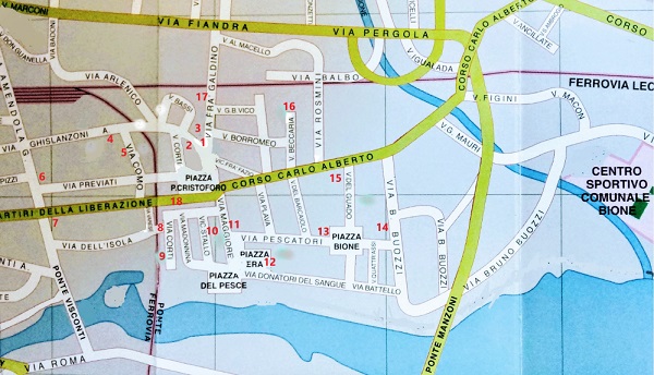 - Piazza Era: casa Bigoni, sede ABIL, ristorante Il Barcaiolo