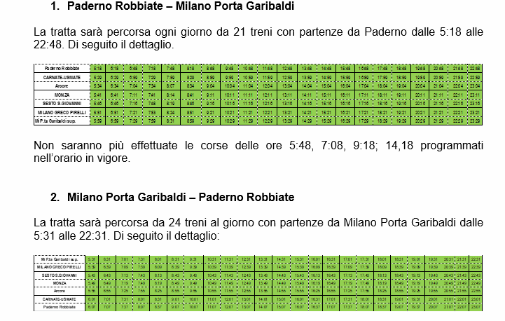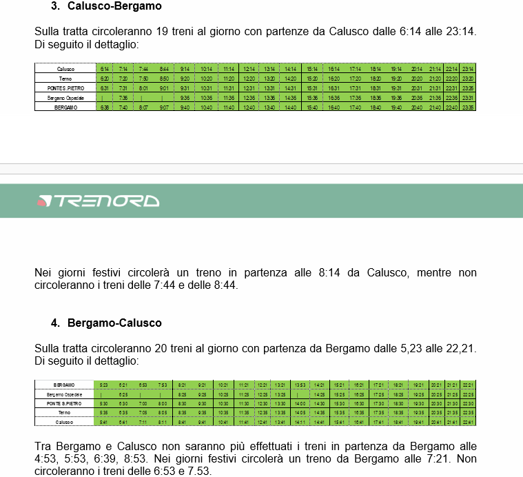 La linea Milano – Monza – Carnate – Bergamo verrà suddivisa in due parti. Una prima linea da Paderno fino a Milano Porta Garibaldi e una seconda avrà capolinea Calusco e arriverà fino a Bergamo. Le due stazioni saranno collegate tramite bus sostitutivi. Da Calusco verso Paderno le partenze saranno ogni ora dalle 5.45 alle 22.45, escluso l’autobus delle 10.45. In direzione opposta ogni ora dalle 6.12 alle 23.12. Il tempo medio di percorrenza è stimato in 45 minuti. L’azienda consiglia ai viaggiatori della tratta Calusco – Ponte san Pietro diretti a Milano di utilizzare i treni in partenza da Bergamo via Pioltello. Le informazioni in tempo reale sono disponibili sull’app di Trenord. Nelle tabelle tutti i dettagli degli orari comunicati da Trenord.