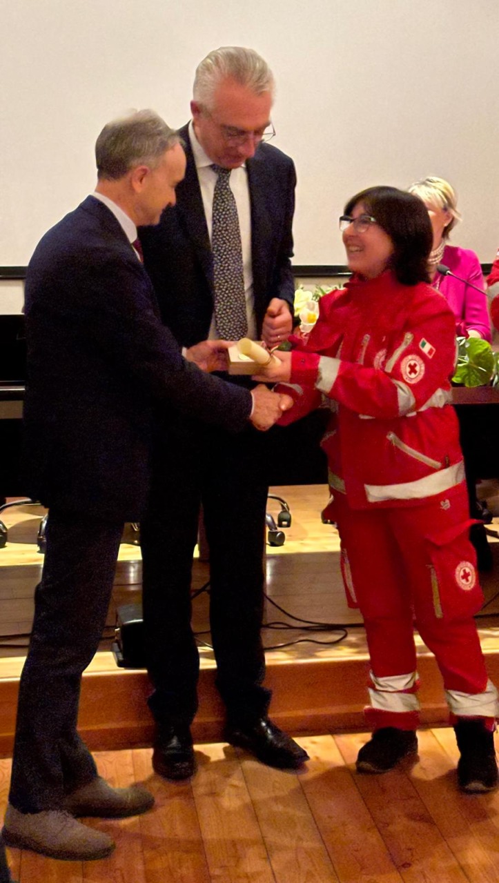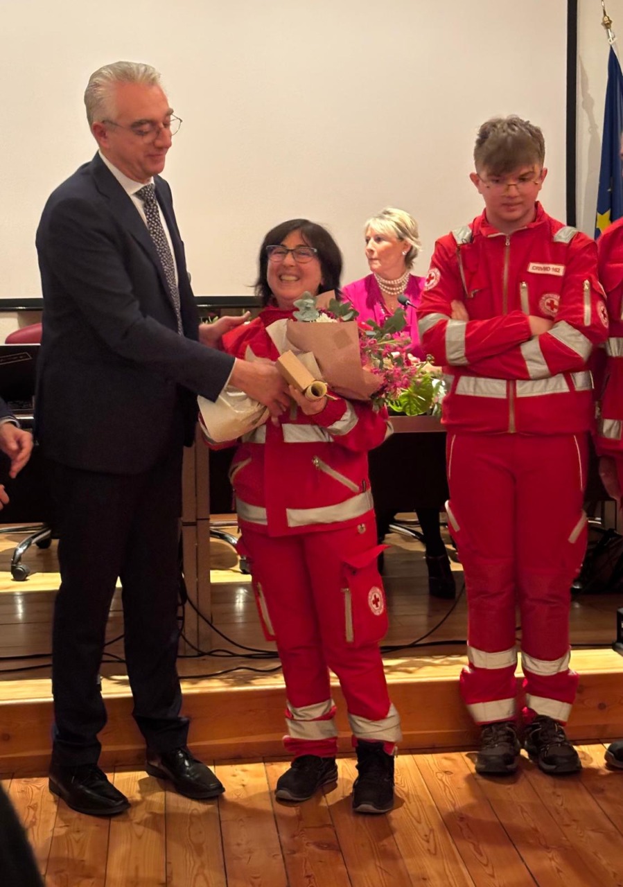 A ritirare la benemerenza per la Cri Valmadrera – la cui candidatura è stata presentata dai Vigili del fuoco di Valmadrera, insigniti lo scorso anno – la presidente Michela Isella, insieme ai presidenti passati e ai fondatori. Come ha ricordato la vicesindaco Raffaella Brioni, il Comitato di Valmadrera nasce nel 2000, dopo aver iniziato la sua attività nel ’95 come delegazione del Comitato di Lecco, e opera anche sui territori di Malgrate, Civate e Oliveto Lario. 131 i soci attivi e 10 i sostenitori, tutti volontari. La Cri Valmadrera effettua interventi di soccorso sanitario in situazioni di emergenza-urgenza 118, trasporti sanitari e socioassistenziali, presta assistenza sanitaria a eventi e manifestazioni sportive sul territorio e organizza corsi per l’utilizzo del defibrillatore aperti alla cittadinanza. Negli anni, il Comitato di Valmadrera si è distinto anche in numerosi interventi come il terremoto di Nocera Umbra (’97), l’emergenza profughi in Kosovo (’99), l’emergenza alluvionale a Cortenova (2002) e l’emergenza Covid 19. Nel 2025 il sodalizio ha festeggiato 30 anni, “un’importante testimonianza di impegno e di altruismo”.