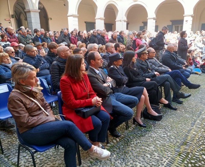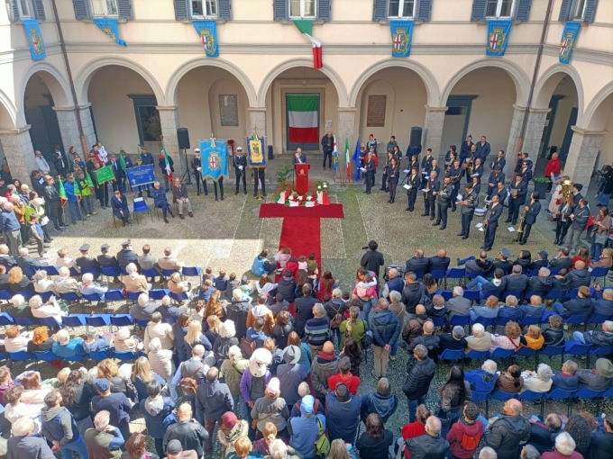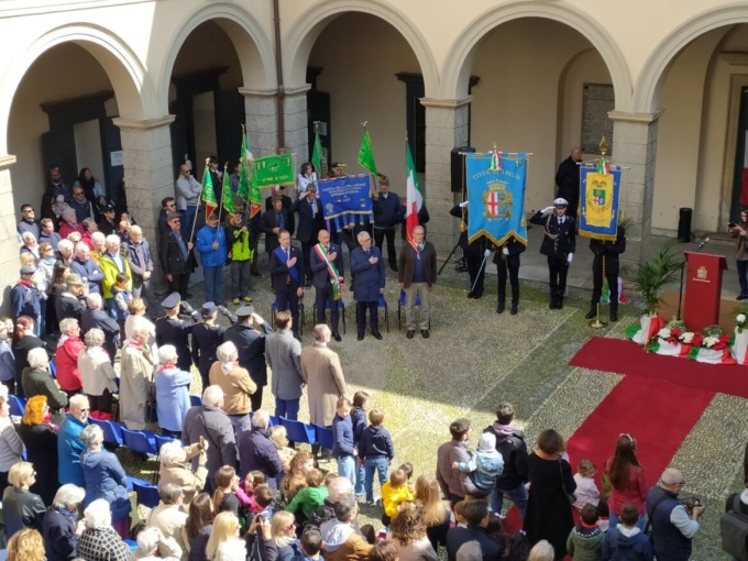 La cerimonia del 25 aprile è poi proseguita nel cortile di Palazzo Bovara dove Raffaella Cerrato, a nome della Tavola della Pace di Lecco, ha letto il decreto con il quale il presidente della Repubblica, il 19 settembre del 1974 ha conferito a Lecco la Medaglia d’Argento al valor militare per l’attività partigiana.