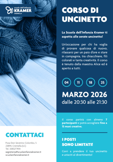 La Scuola dell’Infanzia Kramer propine per il mese di marzo un ciclo di incontri serali dedicato all’uncinetto, aperti a chiunque desideri avvicinarsi a queta tecnica artigianale in un clima informale e conviviale. Gli appuntamenti, guidati dalla maestra Alice, si terranno nelle giornate di martedì 4, 11, 18, 25 marzo, dalle 20.30 alle 21.30 alla sede della scuola. Un’occasione speciale per concedersi un’ora di creatività a fine giornata, tra fili colorati, chiacchiere e nuovi apprendimenti.