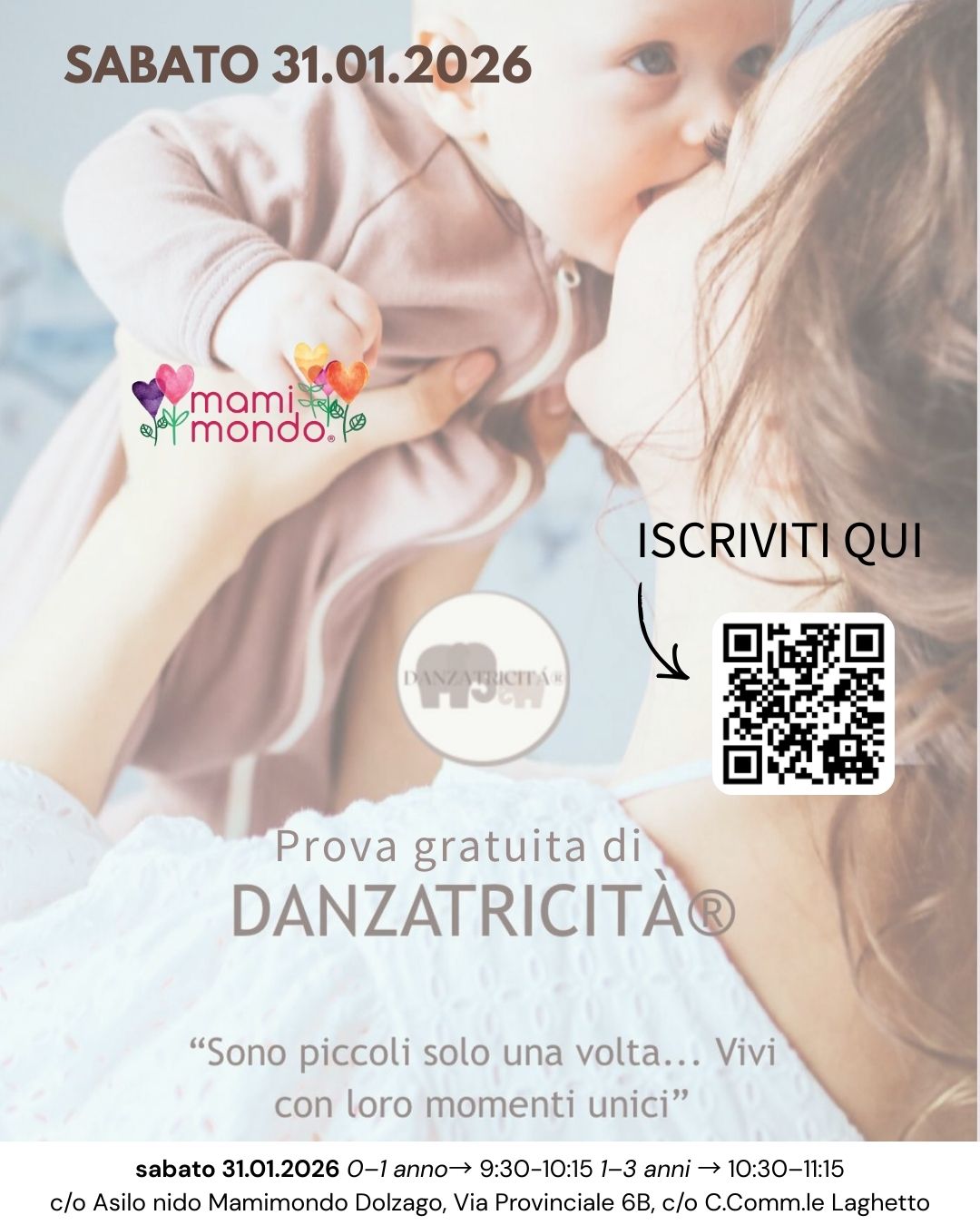 La seconda iniziativa, che si terrà sabato 31 gennaio all’asilo nido Mamimondo di Dolzago (via Provinciale 6B), prevede una prova gratuita di “danzatricità” per bambini 0-1 anno dalle 9.30 alle 10.15 e per bambini 1-3 anni dalle 10.30 alle 11.15. Di seguito la locandina.