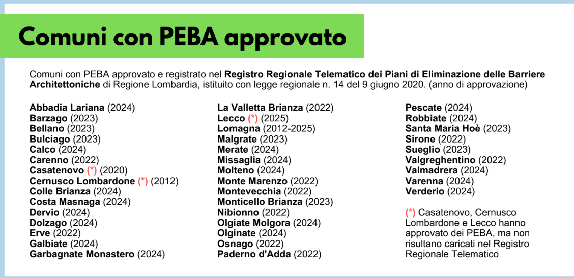 • 39 Comuni hanno un PEBA approvato e registrato nel Registro Regionale Telematico dei Piani di Eliminazione delle Barriere Architettoniche di Regione Lombardia (o comunque pubblicamente consultabile);