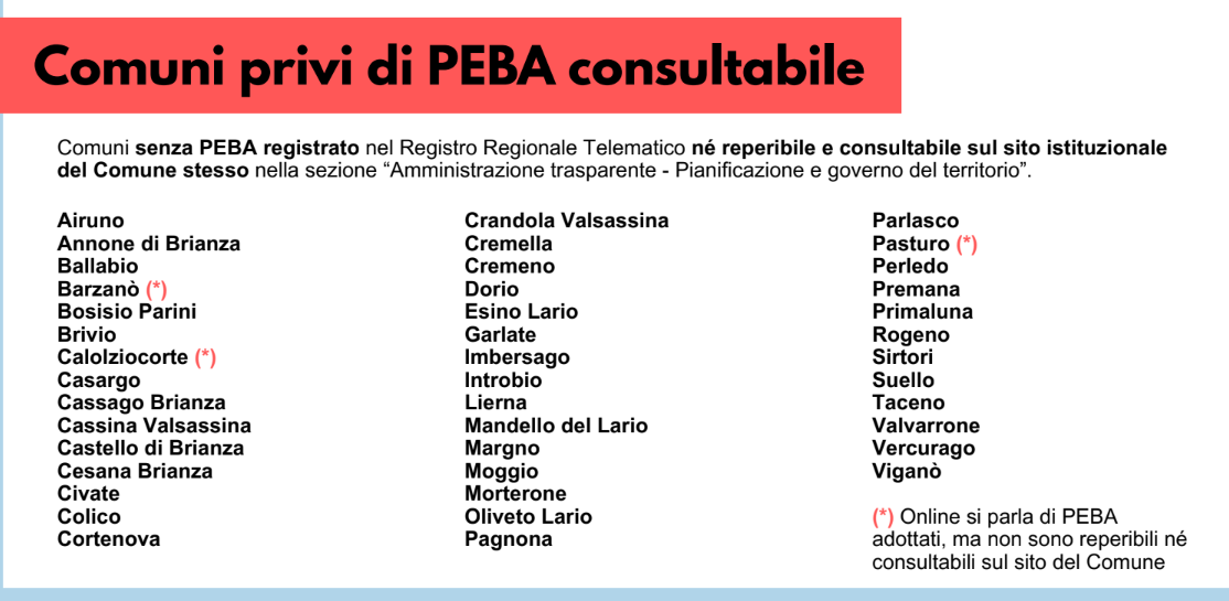 • 42 Comuni sono invece privi di PEBA registrato nel Registro Regionale Telematico né reperibile nella sezione “Amministrazione Trasparente – Pianificazione e governo del territorio” del sito istituzionale.