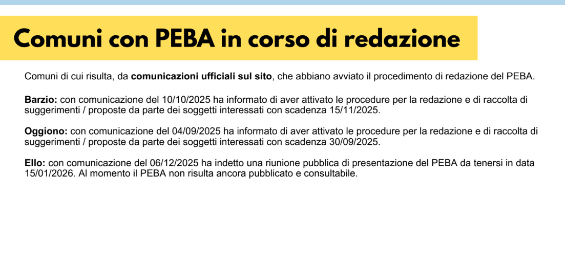 • 3 Comuni risultano aver avviato il procedimento di redazione del PEBA, come comunicato sui rispettivi siti istituzionali;