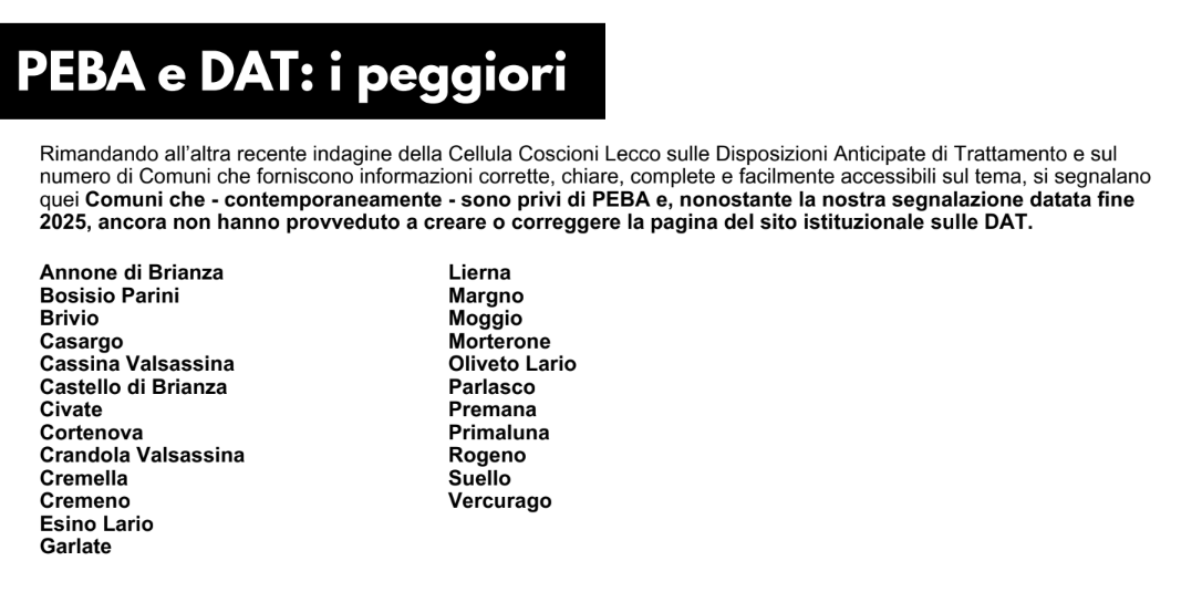 L’indagine richiama anche un’altra recente rilevazione della Cellula Coscioni Lecco sulle Disposizioni Anticipate di Trattamento (DAT). Sono 24 i Comuni lecchesi che, contemporaneamente, risultano privi di PEBA e – nonostante una segnalazione inviata a fine 2025 – non hanno ancora creato o corretto la pagina del sito istituzionale dedicata alle DAT con informazioni corrette, chiare, complete e facilmente accessibili.
