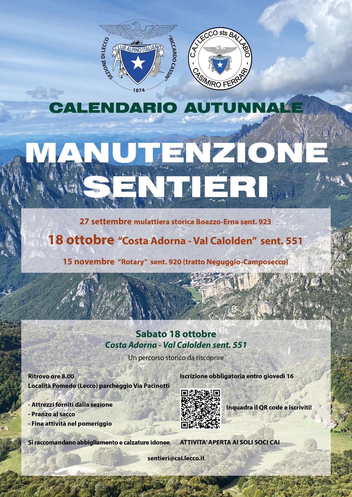 Il 18 ottobre 2025 ci sarà una nuova giornata di manutenzione sentieri tra la Val Calolden e la Costa Adorna con ritrovo alle ore 8.00 parcheggio in località Pomedo, Lecco.