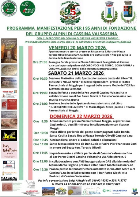 Tre giorni di iniziative per celebrare un traguardo importante per il gruppo alpini locale. A Cassina Valsassina le Penne Nere festeggiano infatti il 95° anniversario di fondazione, con un ricco programma di eventi in calendario dal 20 al 22 marzo. Le celebrazioni sono organizzate con il patrocinio dei Comuni di Cassina Valsassina e Moggio, il sostegno della BCC Valsassina Cremeno e la collaborazione della Pro Loco e del Bar Parco Giochi di Cassina.