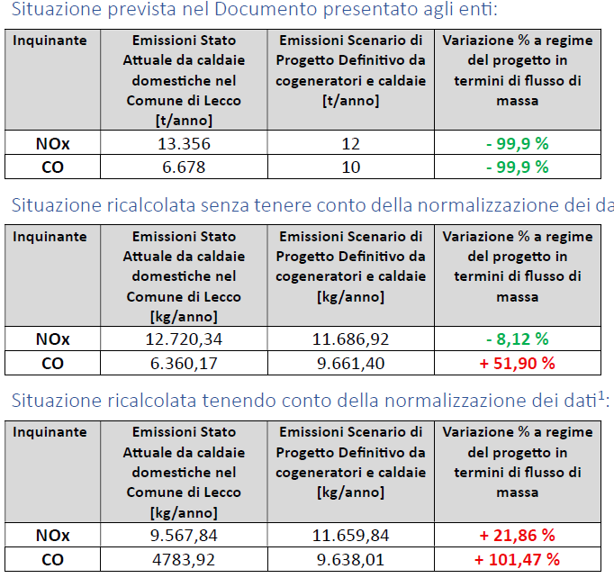 “Noi ci siamo limitati a utilizzare tutti i dati contenuti nella relazione di Tecnohabitat, ma ci siamo resi conto che il valore di confronto degli inquinanti NOx ovvero ossido di azoto e CO monossido di carbonio per la situazione attuale, utilizzato per il confronto con gli stessi valori del progetto, è stato sovrastimato di un fattore 10³ (mille). In realtà la situazione emissiva post intervento, nelle ipotesi indicate nel documento, risulta dello stesso ordine di grandezza della situazione attuale. L’analisi condotta non pretende di sostituirsi al documento originale, per il quale sarebbero necessari studi più approfonditi e una maggiore disponibilità di dati; allo stesso tempo, non è possibile affermare con sicurezza che la grande caldaia del Caleotto provocherà un livello di inquinamento superiore a quello delle caldaie tradizionali, così come non si può escludere che l’impatto ambientale possa risultare molto inferiore o addirittura trascurabile.”
