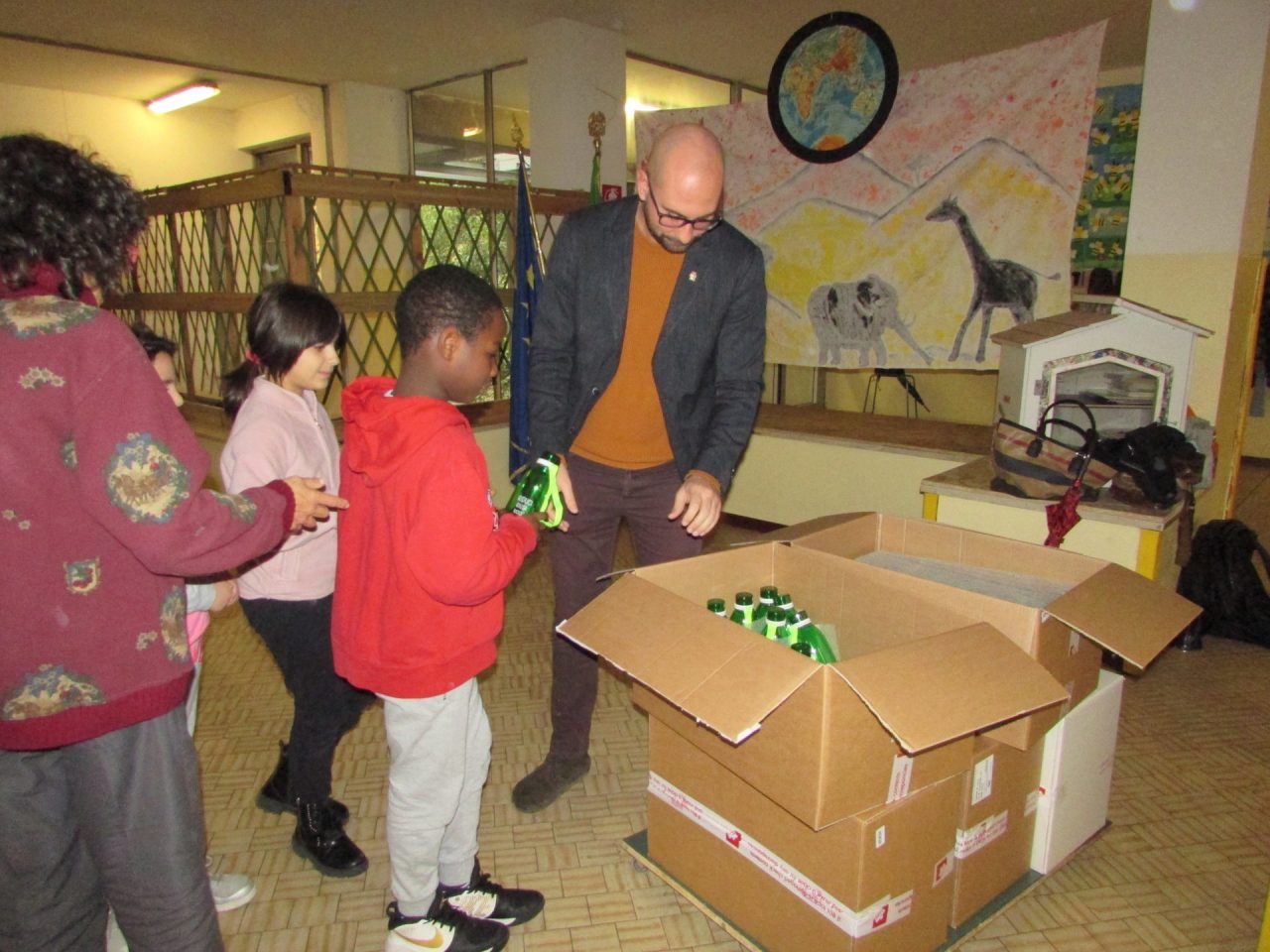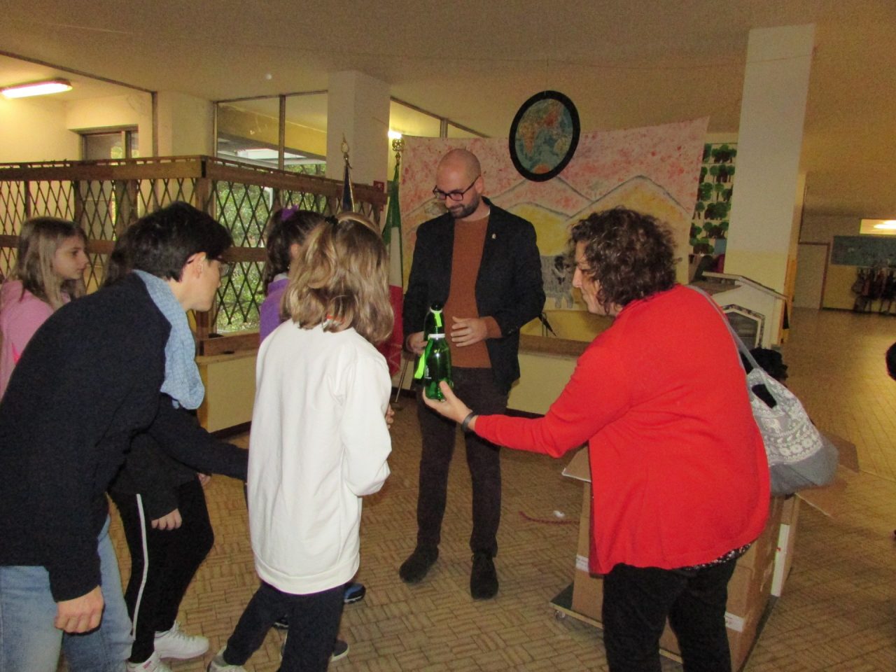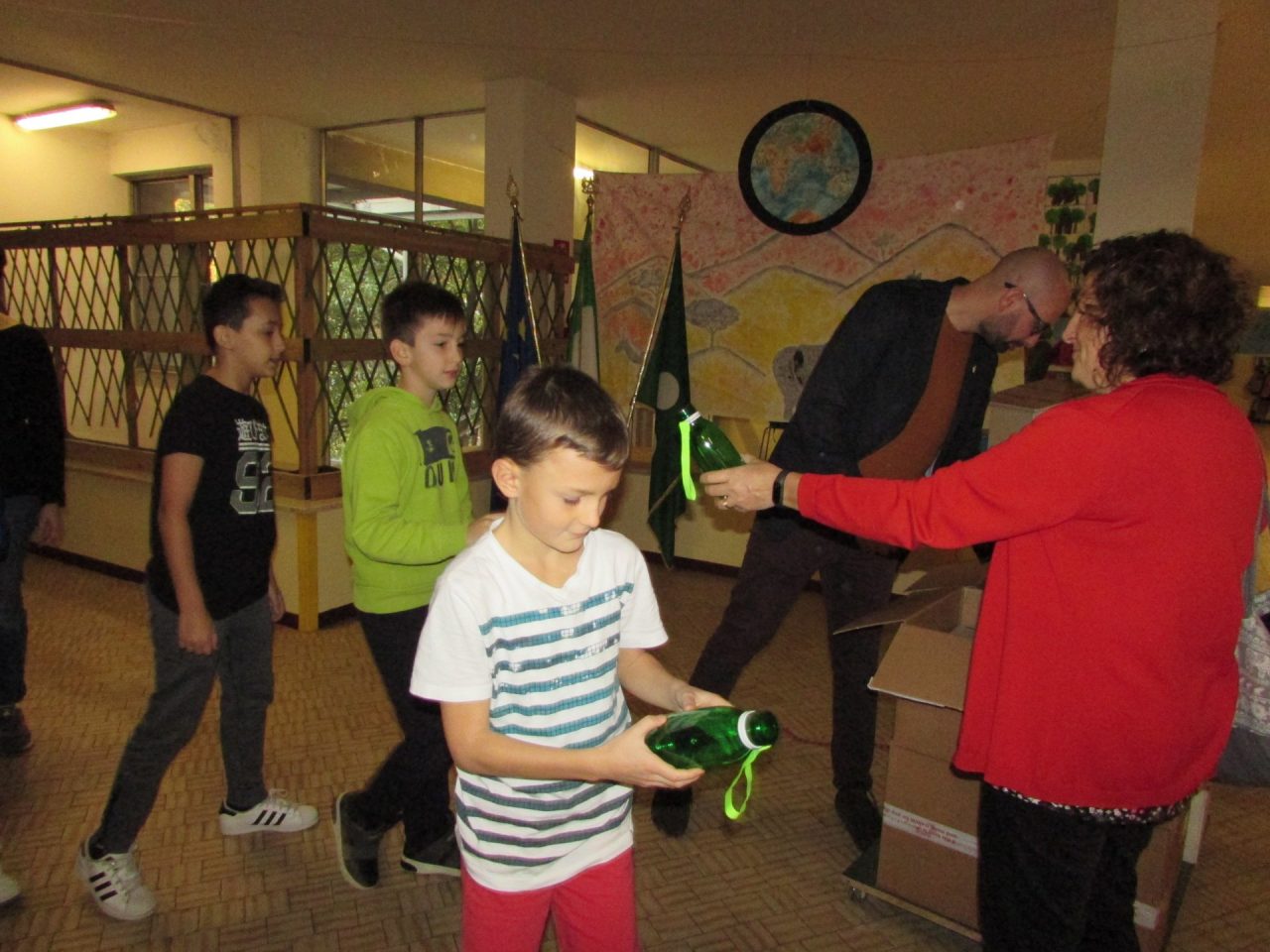 Infine, gli assessori Dossi e Fusi hanno consegnato le borracce alle classi 4^ e 5^ presenti e dato loro il compito di consegnare le restanti alle altre classi. Questa è stata solo la prima tappa di questa giornata che coinvolgerà altri istituiti lecchesi: la scuola media A. Stoppani e le scuole Primarie Scola e Kolbe; si proseguirà con l’Istituto Maria Ausiliatrice e il Collegio Volta; infine toccherà alla scuola secondaria di primo grado Don G. Ticozzi.