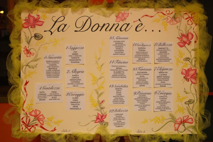 Dal primo gradino fino all’interno del locale regnava sovrana la mimosa, con i 15 tavoli allestiti a tema “La Donna è…”: partendo dal tavolo “Saggezza”, con una bella compagnia classe 1933, si è arrivati fino ad arrivare alla partecipante più giovane, di 6 anni, al tavolo “Sensibilità”.