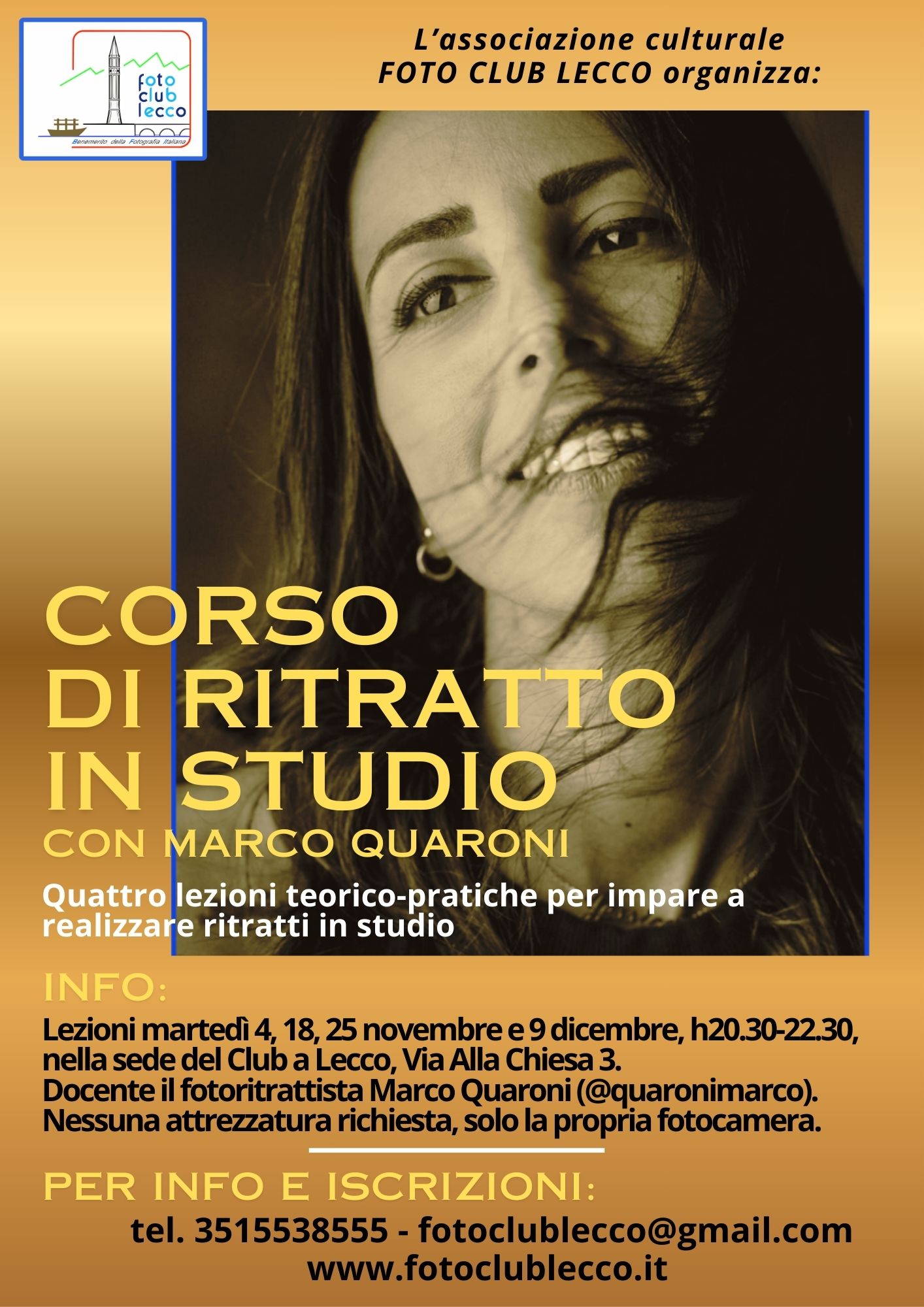 Una proposta diretta a tutti coloro che già hanno dimestichezza col mezzo fotografico ma vogliono imparare a destreggiarsi anche in studio per realizzare dei ritratti. Il corso si terrà su quattro lezioni serali e vedrà come docente Marco Quaroni, fotoritrattista di ottimo livello, coadiuvato dai soci del club.