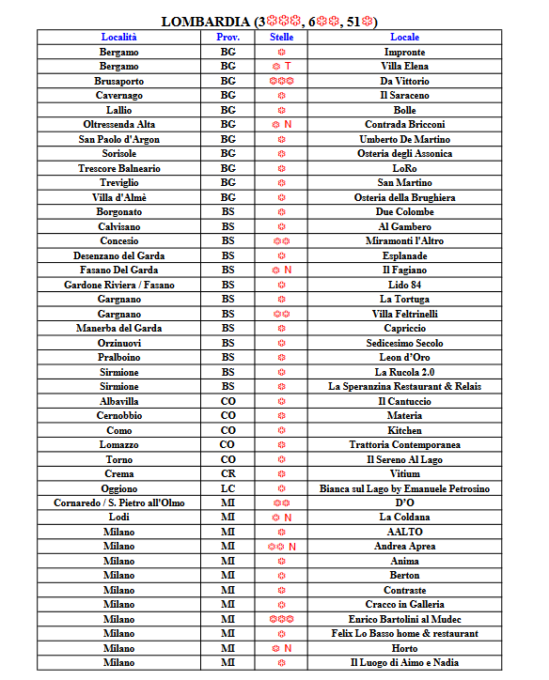 Nella classifica delle Stelle MICHELIN per regioni, la Lombardia mantiene la leadership con 60 ristoranti (3 tre Stelle, 6 due Stelle, 51 una Stella), la Campania si conferma al secondo posto con 51 ristoranti, (1 tre Stelle, 8 due Stelle, 42 una Stella), mentre sul terzo gradino del podio troviamo la Toscana con 41 ristoranti (1 tre Stelle,5 due Stelle,35 una Stella). Scivola in quarta posizione il Piemonte con 40 ristoranti (2 tre Stelle,4 due Stelle,34 una Stella), mentre conferma il quinto posto il Veneto con 32 ristoranti Stellati (1 tre Stelle, 4 due Stelle, 27 una Stella).