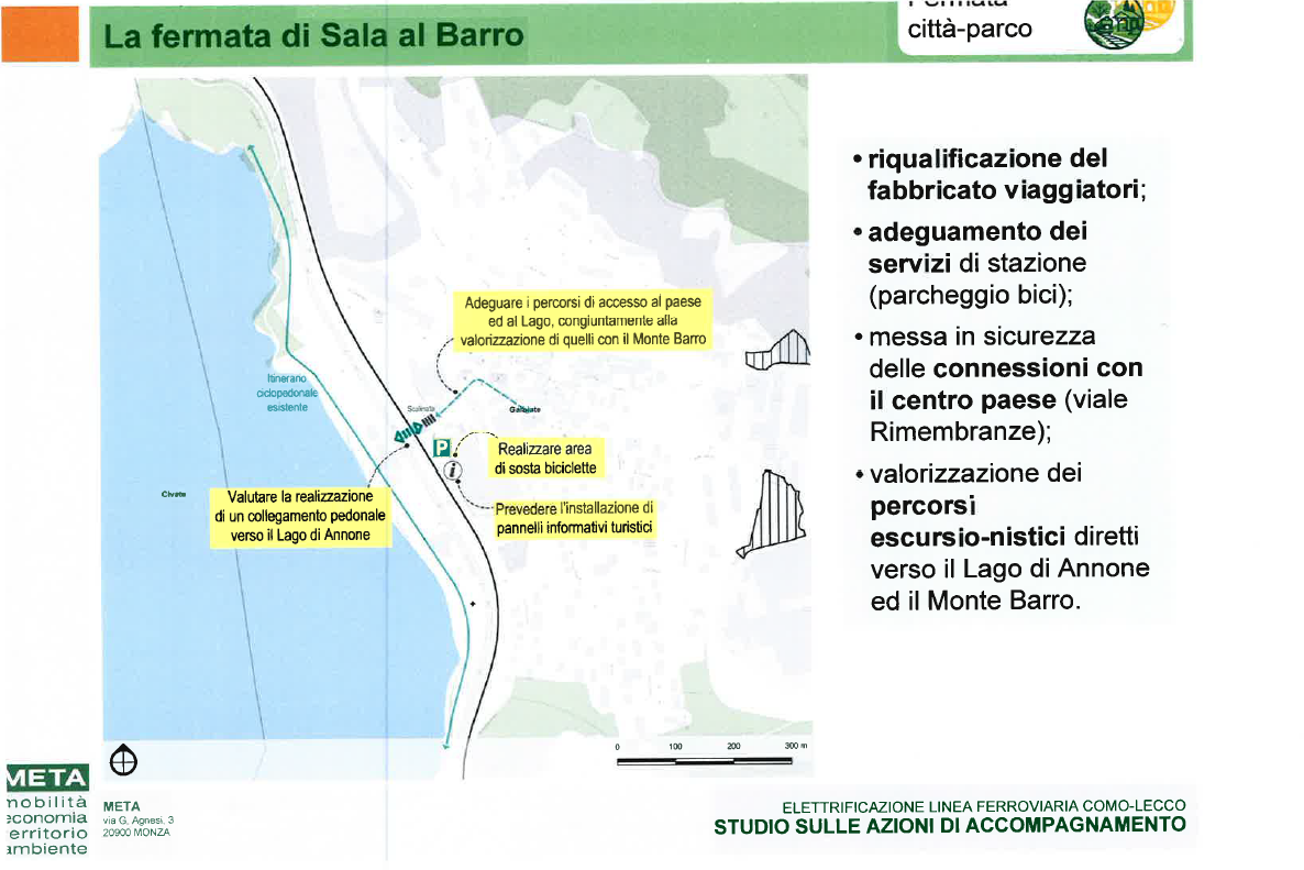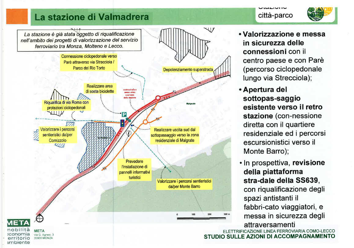 Valmadrera: valorizzazione e messa in sicurezza dei collegamenti con il centro paese e con Parè, apertura del sottopassaggio esistente verso il retrostazione per migliorare l’accessibilità ai quartieri residenziali e ai percorsi escursionistici verso il Monte Barro. In prospettiva, è prevista anche la revisione della piattaforma stradale della SS639.