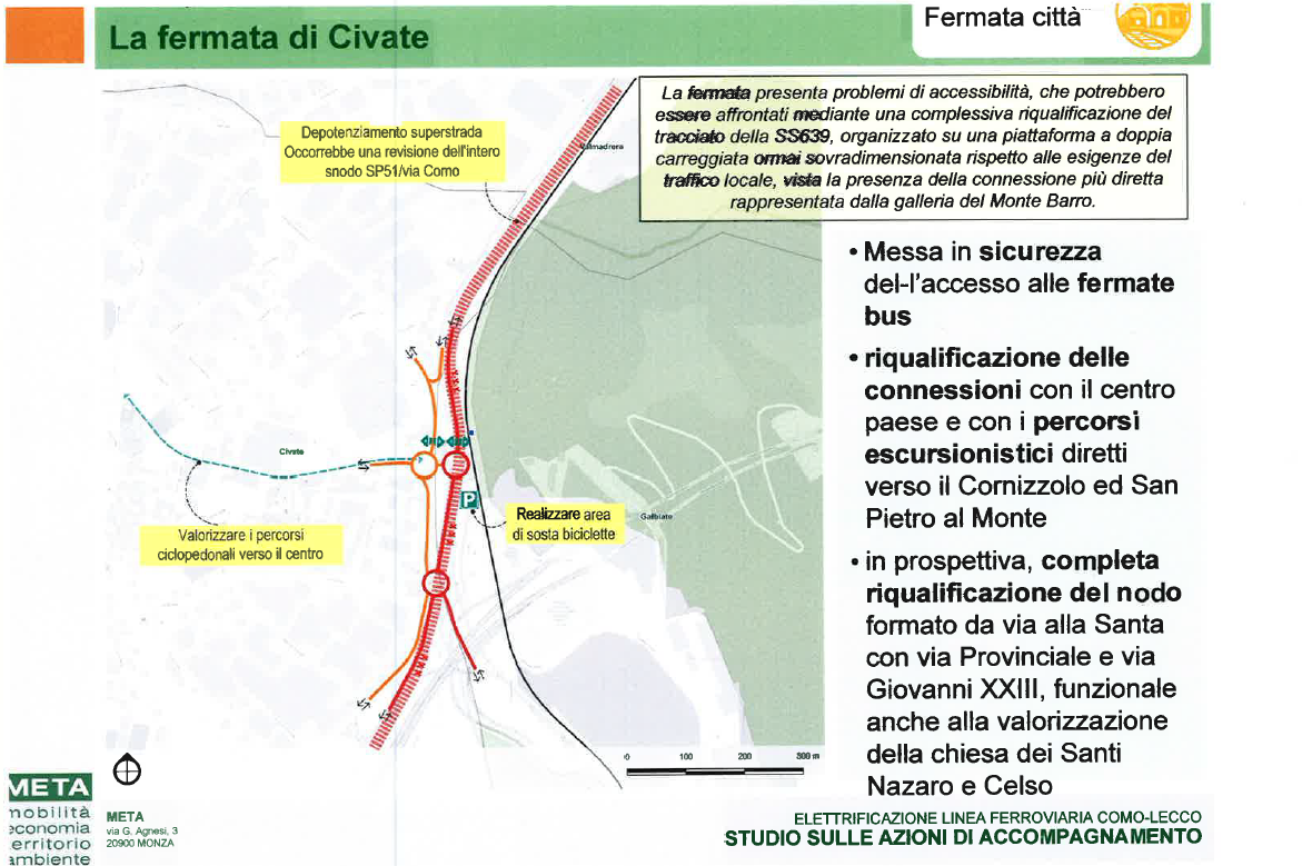 Civate: messa in sicurezza dell’accesso alle fermate bus, riqualificazione delle connessioni con il centro paese e con i percorsi escursionistici diretti verso il Monte Cornizzolo e San Pietro al Monte. In prospettiva, completa riqualificazione del nodo tra via alla Santa, via Provinciale e via Giovanni XXIII, funzionale anche alla valorizzazione della chiesa dei Santi Nazaro e Celso. La fermata presenta attualmente problemi di accessibilità, che potrebbero essere risolti attraverso una riorganizzazione del tracciato della SS639.