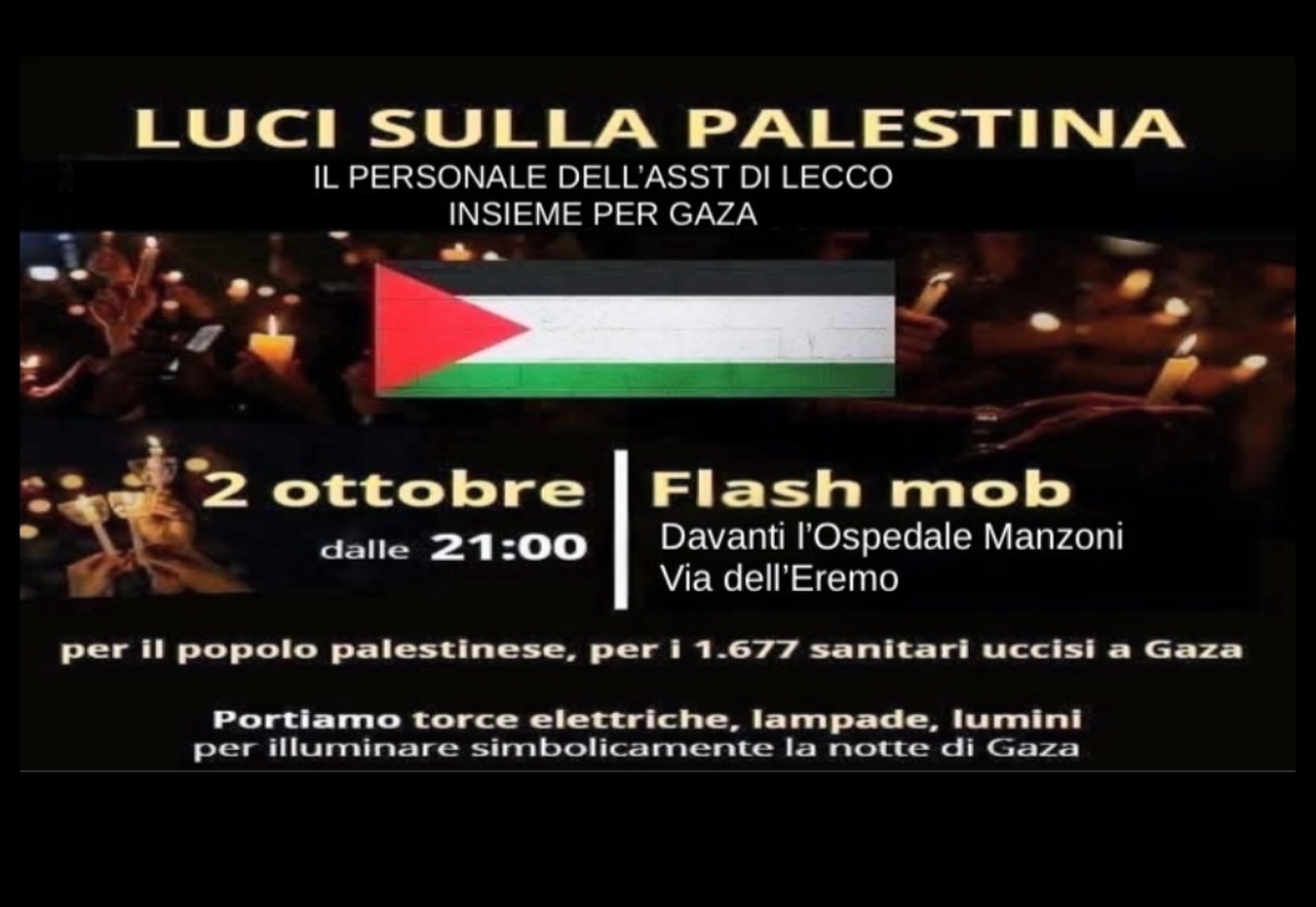 A Lecco, davanti all’Ospedale Alessandro Manzoni, saranno almeno un centinaio gli operatori sanitari che parteciperanno all’iniziativa “Luci sulla Palestina: 100 Ospedali per Gaza” in programma  domani giovedì 2 ottobre 2025, alle  21. Medici, infermieri e personale sanitario si raduneranno per accendere torce, lumini e lampade, illuminando simbolicamente la notte di Gaza e rendendo omaggio agli oltre 1.677 colleghi e colleghe uccisi mentre assistevano la popolazione palestinese. Un analogo presidio avrà luogo anche davanti   all’ingresso principale della Nostra Famiglia;  “Saremo sanitari, ma anche amici parenti figli nonni…un popolo intero che porta LUCE, crede e chiede la PACE” spiegano  da di Bosisio Parini.