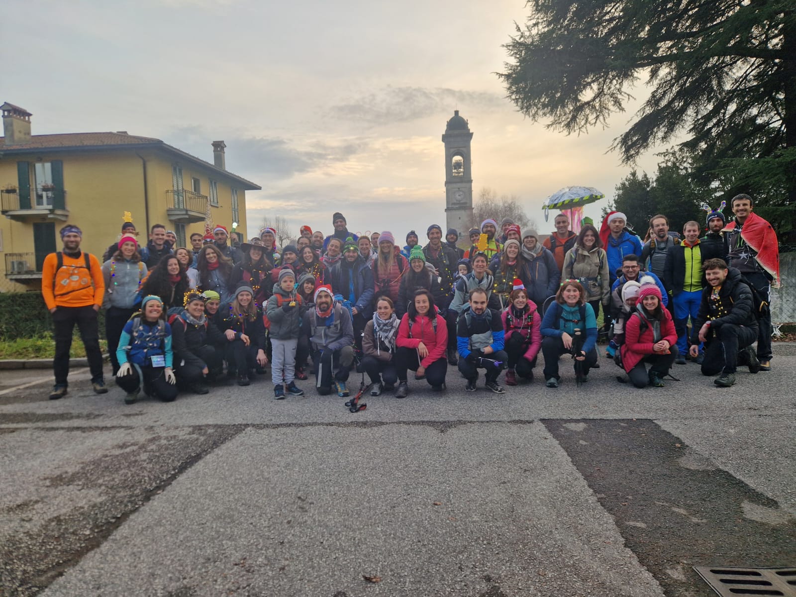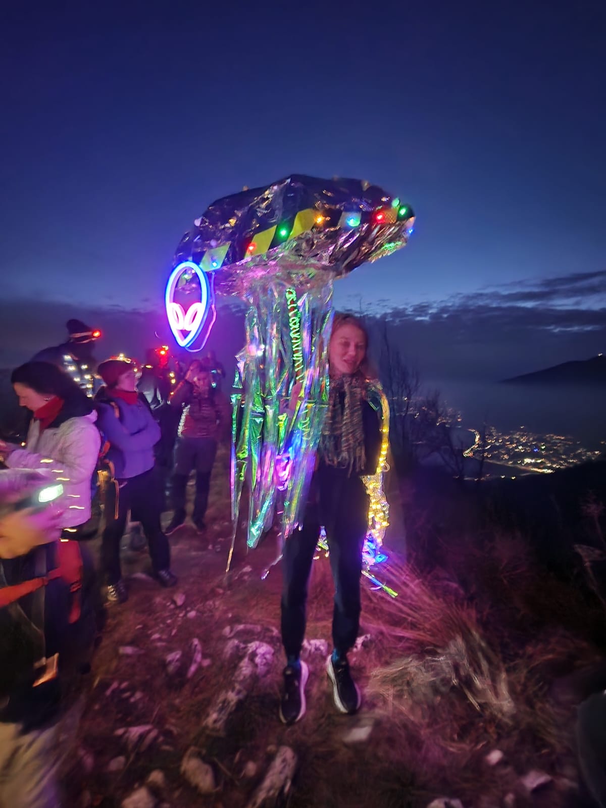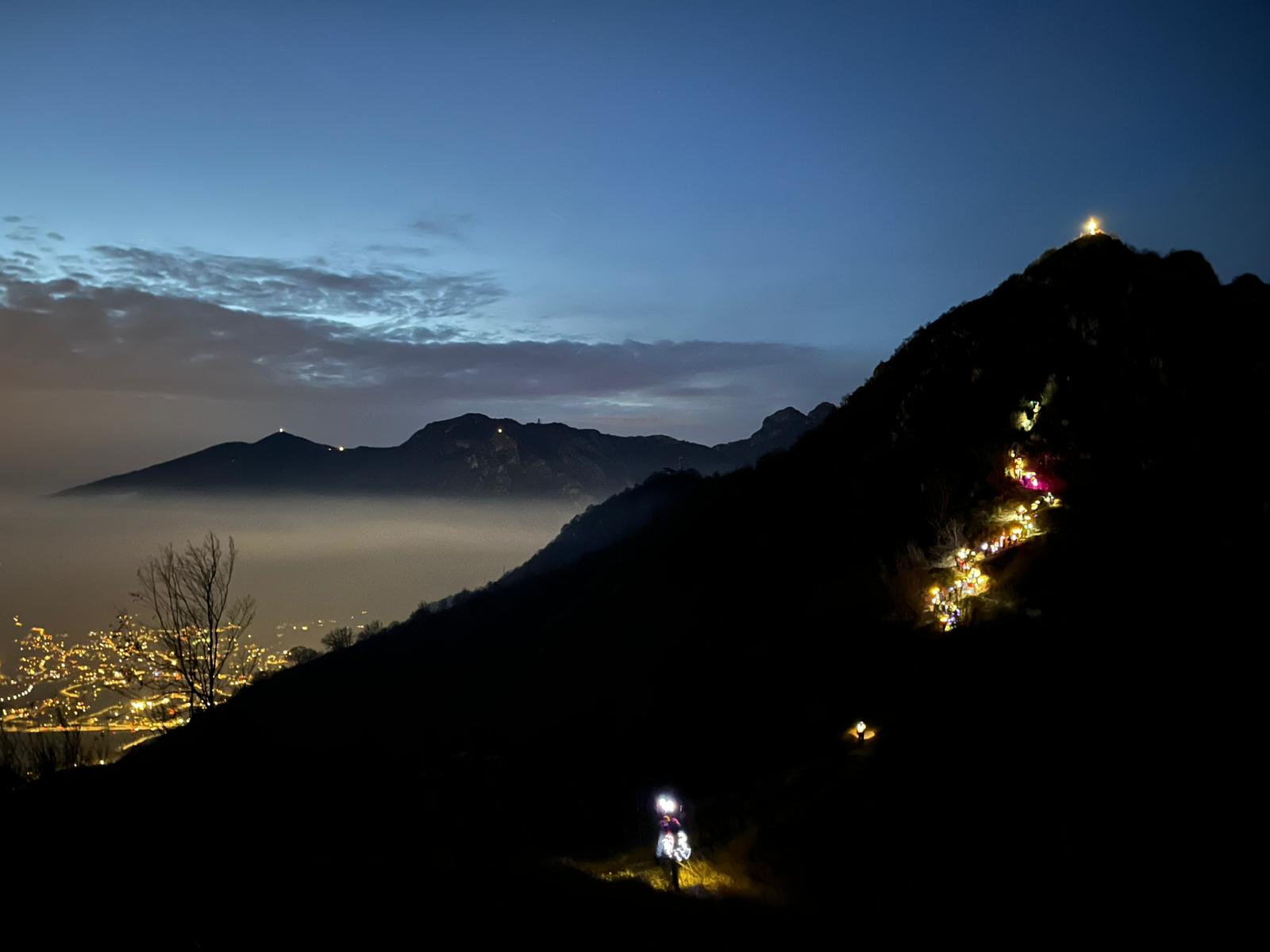 Sessanta e più persone, abbigliate in modi simpatici e festivi e adornate da luminosissime e coloratissime lucine elettriche, sono risalite per il panoramico sentiero delle creste. Salendo con calma, hanno potuto ammirare i laghi di Pusiano e Annone e le cime vicine, come le Grigne.