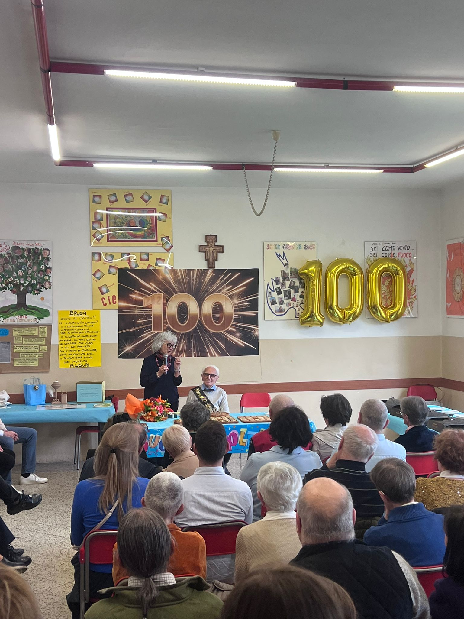 Emozionante il video che le operatrici del centro hanno preparato e mostrato nel corso del pomeriggio, che univa spezzoni di micro-interviste a tutti gli ospiti, ognuno dei quali esprimeva il proprio personale messaggio di auguri. Oltre al video, le operatrici hanno realizzato anche un biglietto cartaceo, raccogliendo diversi scatti di Luigi, accompagnati da parole che venivano dal cuore. Attenzioni che hanno profondamente commosso ed emozionato Luigi, comprensibilmente felice di vedere da quanto affetto fosse circondato. Molto belle anche le parole scritte dai figli in un cartellone appeso nel salone del centro, allestito per l’occasione con tavoli adorni di fiori: «Brusa, siamo al centro! Ma… il centro del tuo lavoro? … o il centro della tavola? O possiamo dire che “Sei al centro dell’attenzione” o “Al centro dei nostri cuori”. Ma forse… hai fatto centro nel compiere i tuoi 100, a cui sei arrivato con l’intento di continuare, lento, ma convinto che il tempo ti sarà amico ogni momento». Agli auguri si sono uniti Isa, educatrice del centro, e Fabio Crimella, vice presidente della cooperativa sociale «L’Arcobaleno».
