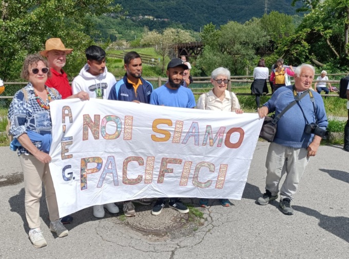 Caglio ha esordito spiegando il senso della marcia: “Questa marcia inizia e prosegue lungo la riva del nostro fiume Adda, con un percorso significativo poiché l’acqua è portatrice di vita e noi siamo qui a ribadire che la vita è un bene importante e che la guerra è una follia perché distrugge in maniera indiscriminata la vita”.