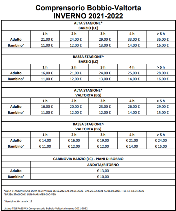 Analizzando le tariffe della passata stagione con quelle della 2022/2023 che è alle porte emerge che il costo dei giornalieri per gli adulti in alta stagione è aumentato del 14,2% a Bobbio (è passato da 36 a 42 euro) e del 14,7% in Valtorta (da 29 a 34 euro).