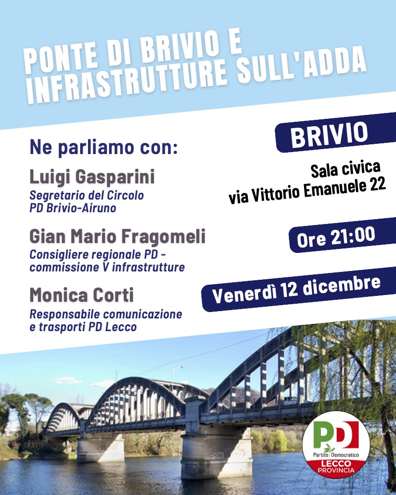 “La questione della riqualificazione degli attraversamenti sull’Adda, da Lecco al meratese, rappresenta per il PD di Lecco una priorità per la mobilità di tutto il territorio – fanno sapere dal partito – Per questo saremo a Brivio il 12 dicembre alle 21 in Sala Civica (Via Vittorio Emanuele 22) per parlarne assieme a Gian Mario Fragomeli, Consigliere regionale PD in commissione V infrastrutture, Monica Corti, Responsabile comunicazione e trasporti provinciale, e Luigi Gasparini, Segretario del Circolo PD di Airuno-Brivio”.