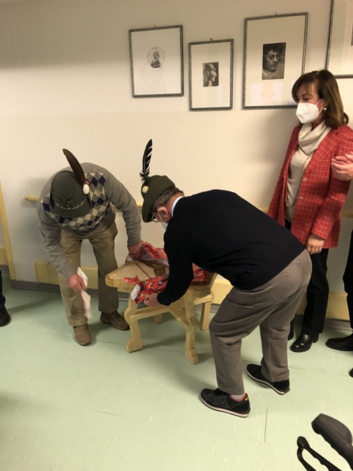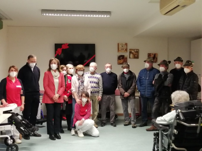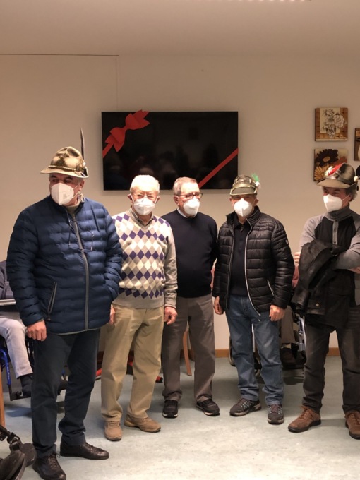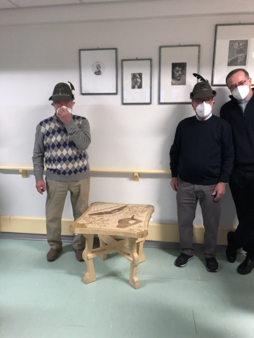 “Poter finalmente entrare in RSA con le dovute precauzioni ma incontrando gli Ospiti è stato per noi una gioia che si aggiunge al dono che abbiamo portato: un televisore che facilita accesso alle informazioni e la visione e partecipazione collettiva degli Ospiti ai momenti di svago ai quali hanno diritto dopo una vita di lavoro e di impegno  –  commentano i vice capogruppo ANA Renato Anghileri  e  Enrico Longhi  – La generosità degli Alpini si è quest’anno arricchita con un’ulteriore donazione di un nostro socio: imprenditore sul lavoro, paracadutista a militare, Alpino per tutta la vita il  Davide Vassena ha realizzato e decorato con le proprie mani un tavolino in legno, impreziosito sul piano da un fine lavoro di mosaico nel legno che sarà non solo segno di una bellezza artigianale ma ripiano utile nella zona collettiva al 3° piano”.