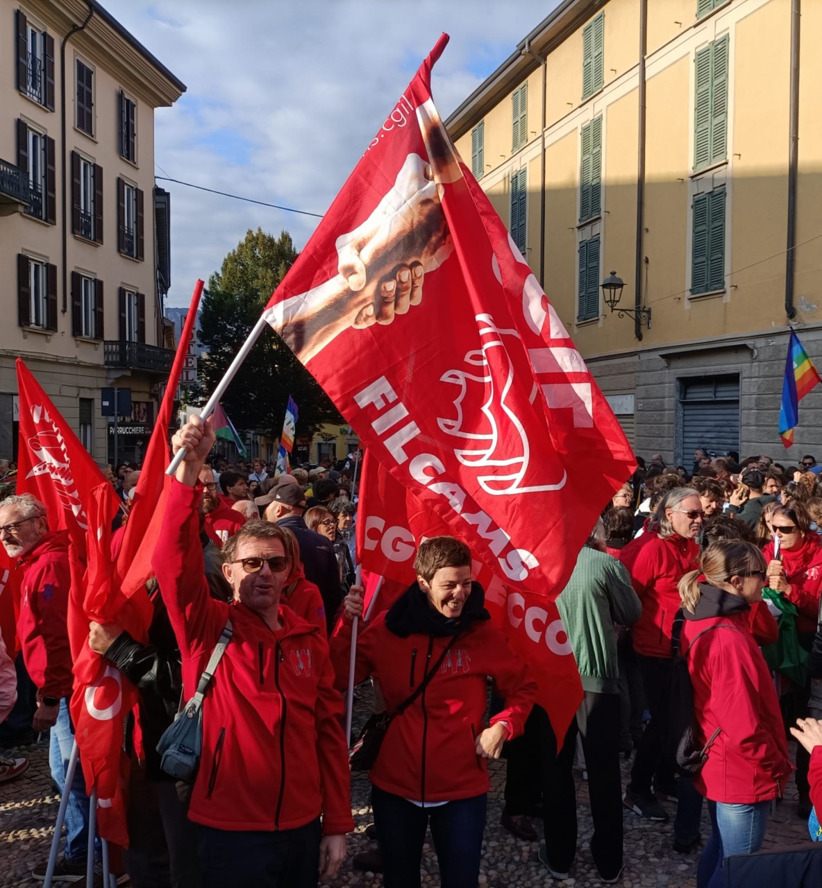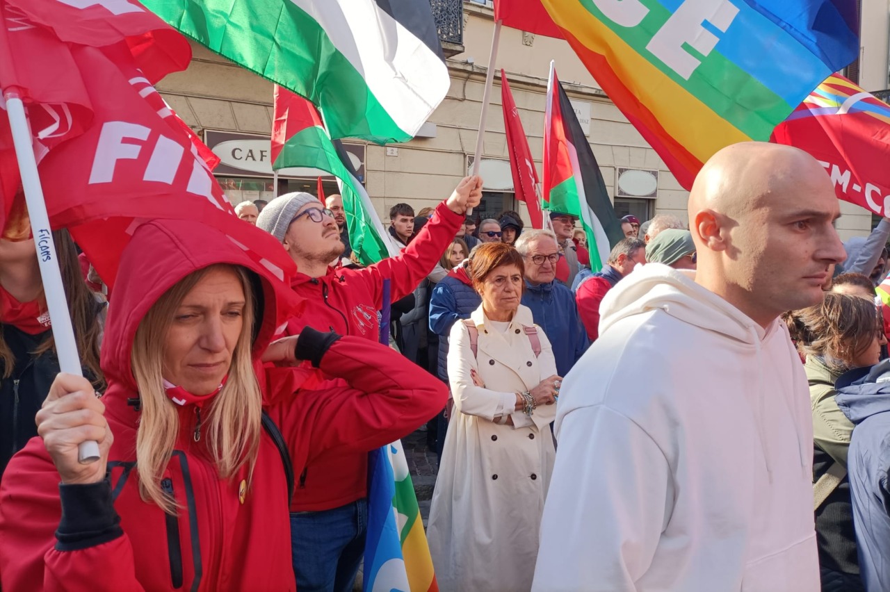 “Ci fermiamo perché davanti a un genocidio, alla violazione sistematica dei diritti umani, alla distruzione di un popolo, il lavoro non può continuare come se nulla fosse – ha proseguito il numero uno della Cgil di Lecco – Negli ultimi giorni la situazione è ulteriormente precipitata. Gaza è una città martoriata: ospedali distrutti, bambini senza acqua e cure, interi quartieri cancellati dalle mappe. È un luogo dove la vita è diventata sopravvivenza, e dove ogni giorno si consuma un crimine contro l’umanità sotto gli occhi di un mondo troppo spesso indifferente. Eppure, mentre tutto questo accade, c’è chi ha avuto il coraggio di agire. Decine di barche della Flotilla, partite da 44 Paesi diversi, hanno cercato di aprire un corridoio umanitario verso Gaza, di rompere un blocco navale illegale e disumano, portando cibo, medicine, acqua, vita. Quell’azione non violenta, coraggiosa e piena di speranza è stata fermata con la forza: navi sequestrate, persone arrestate, aiuti bloccati. È davanti a questo che oggi siamo in piazza. Lo sciopero generale proclamato dalla CGIL è la nostra risposta collettiva a questa ingiustizia. È un grido che attraversa fabbriche, scuole, uffici e piazze. Oggi, da questa piazza, vogliamo ricordare che il lavoro non è solo produzione, ma dignità, partecipazione e impegno per il bene comune. Quando milioni di lavoratrici e lavoratori si fermano, lo fanno per affermare che nessuna economia può dirsi giusta se poggia sull’oppressione di altri popoli. Lo fanno per dire che le risorse devono essere destinate alla pace, ai diritti, al welfare, alla scuola, alla sanità e alla giustizia sociale, non alla guerra, non alle armi, non alle logiche di potenza. Questo sciopero ci ricorda che il lavoro, quando è unito, può cambiare la storia. La forza di questa giornata sta nella capacità di trasformare indignazione in azione collettiva, di rendere concreta la solidarietà internazionale, di dimostrare che il movimento del lavoro è, e sarà sempre, presidio di pace, giustizia e libertà. Ma questa forza diventa ancora più grande quando, al fianco di lavoratrici e lavoratori, si muovono anche la scuola e gli studenti, le pensionate e i pensionati, le cittadine e i cittadini comuni. Ed è da questa forza comune che nasce la nostra convinzione più profonda: il lavoro senza diritti non è libertà. Come ricordava Gino Strada, ‘I diritti degli uomini devono essere di tutti gli uomini, proprio di tutti, sennò chiamateli privilegi.’ Da qui, da questa piazza, parte un messaggio forte: non ci fermeremo. Finché la comunità internazionale non assumerà pienamente le proprie responsabilità — nel far rispettare il diritto internazionale, nel difendere la dignità umana e nel costruire un futuro di pace e giustizia — continueremo a lottare. Continueremo a organizzarci e a mobilitarci, perché costruire pace e giustizia è la nostra responsabilità e il nostro compito. Grazie a tutte e a tutti voi. La storia non si cambia da spettatori: si cambia insieme, come oggi, uniti in questa piazza, con il coraggio e la forza del lavoro”.