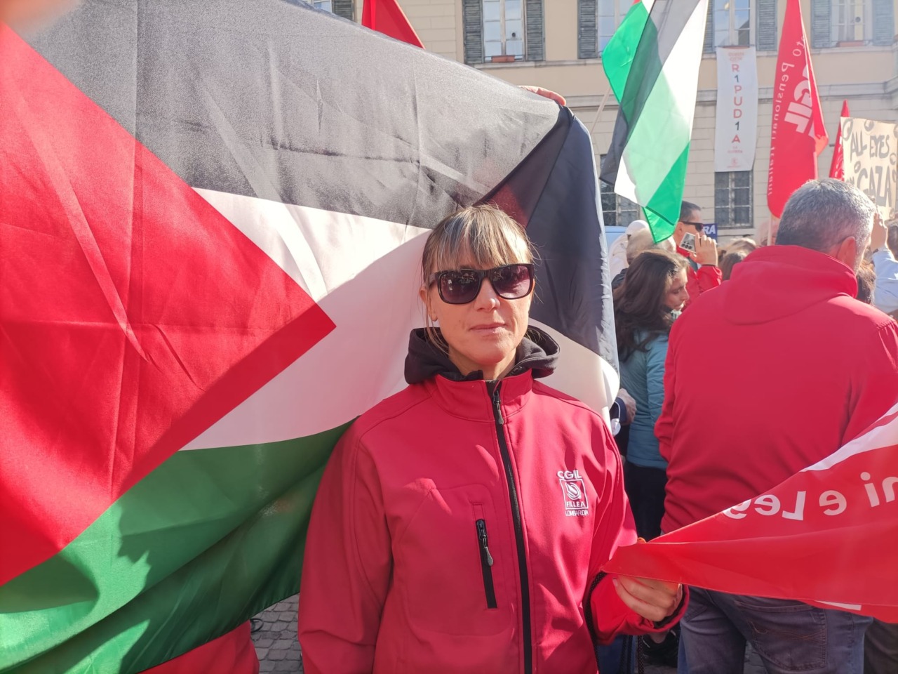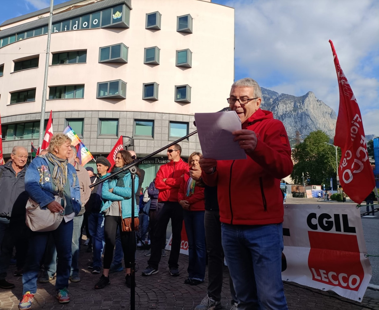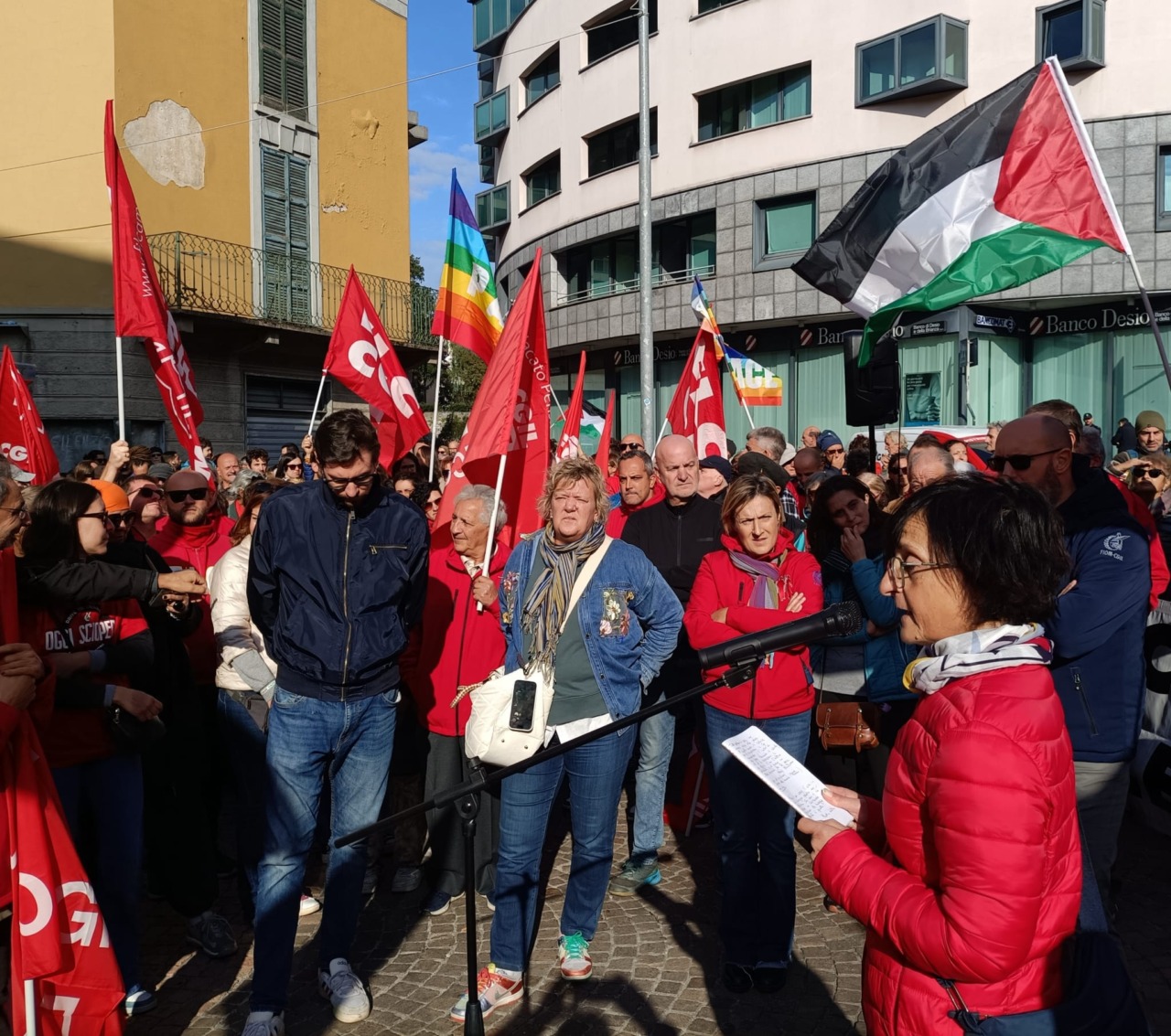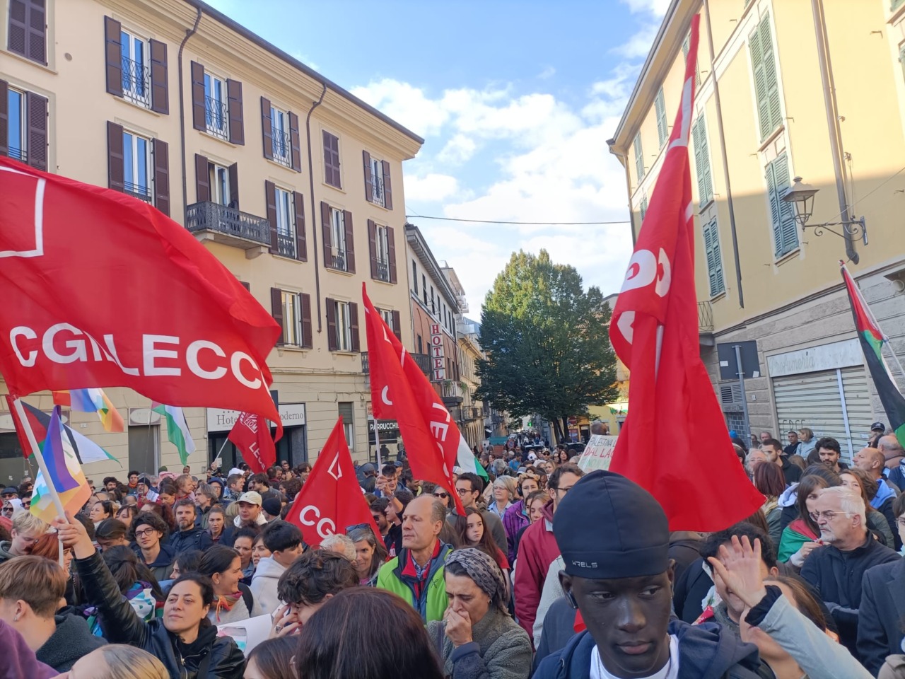Al microfono si sono alternate testimonianze di lavoratori del settore pubblico e privato, studenti, pensionati, e sindacalisti coi loro appelli e inviti, mentre in piazza sventolavano bandiere della pace, delle sigle sindacali e della Palestina. Anche il sindaco di Lecco, Mauro Gattinoni, si è affacciato da Palazzo Bovara, stringendo tra le mani ed esponendo il vessillo palestinese.