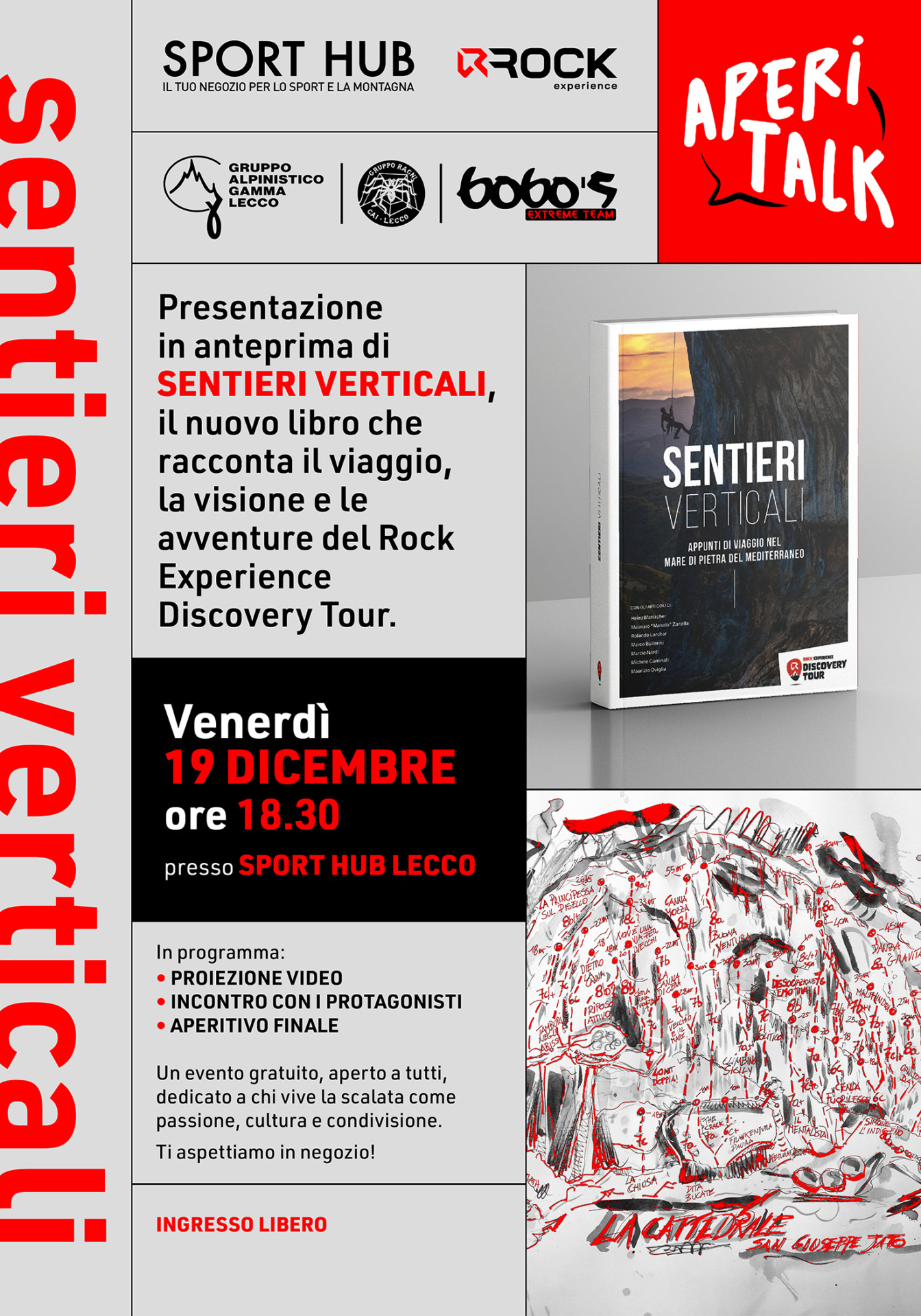 Venerdì 19 dicembre 2025 alle 18,30 al negozio SportHub di via Rivolta 14 a Lecco si terrà un “aperitalk” a ingresso libero, dedicato alla presentazione del volume Sentieri Verticali, con la partecipazione degli scalatori che hanno preso parte alle tappe del Discovery Tour e la proiezione delle più belle immagini e video dei viaggi. L’ingresso all’evento è libero, a seguire verrà offerto un aperitivo.