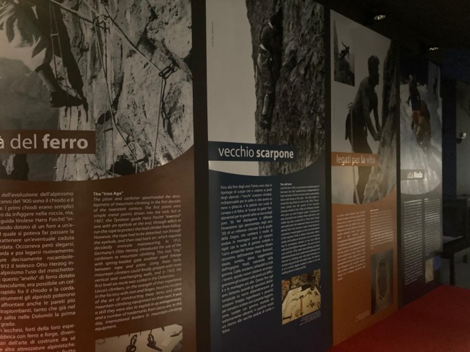 Un lavoro di catalogazione enorme che ha portato poi nel 2018 al trasferimento a Palazzo delle Paure e al nuovo allestimento di oggi che ha permesso al museo di rimarcare la propria identità con un approfondimento delle radici dell’associazione. Un allestimento che è stato curato dall’architetto Alessandro Dubini che ne ha illustrato le peculiarità: “Abbiamo contestualizzato tutti gli oggetti con una fotografia e li abbiamo collegati ad ambienti e persone per riconoscere la storia di chi li ha utilizzati. All’ingresso della sala c’è un pannello con i volti dei 5 fondatori del Cai Lecco. Poi c’è la sezione dell’arrampicata su roccia, quella su ghiaccio, un approfondimento su tre importanti spedizioni e uno spazio dedicato al Soccorso Alpino. In mezzo un grande mondo con indicate montagne e nomi di alpinisti. L’obiettivo è che sia un percorso intuitivo anche per chi non conosce la storia del Cai”.