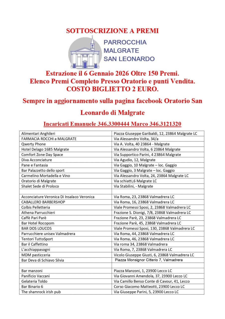 Sottoscrizione a premi con la parrocchia di Malgrate: da ieri, venerdì 14 novembre 2025, è possibile acquistare i biglietti per l’estrazione, in programma per il 6 gennaio 2026.