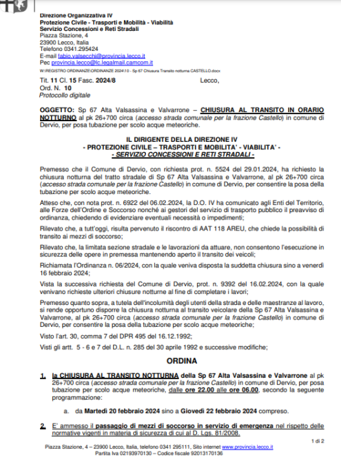 La Provincia di Lecco ha disposto la chiusura al transito in orario notturno della strada provinciale 67 Alta Valsassina e Valvarrone a Castello di Dervio, dalle 22 alle 6 da martedì 20 a giovedì 22 febbraio, per posa tubazione scolo acque meteoriche.
