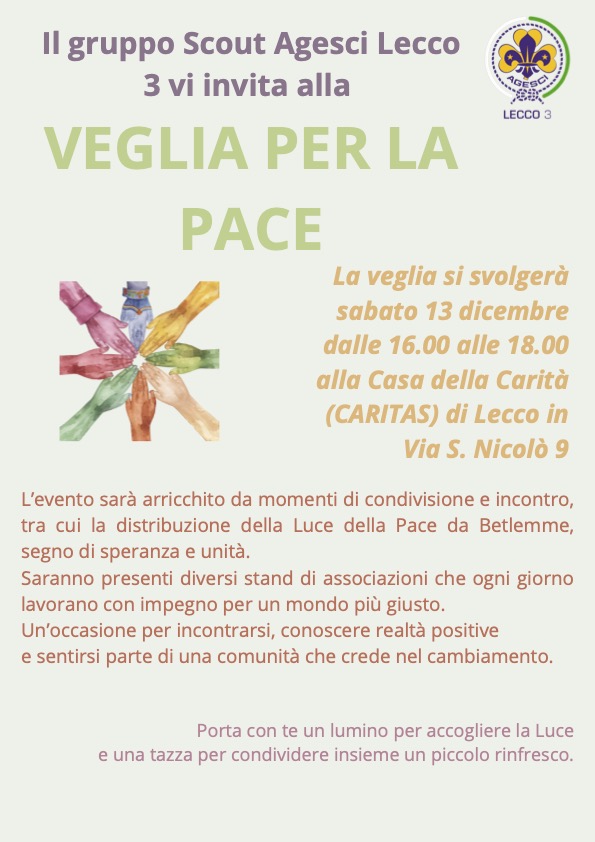 Il gruppo scout AGESCI Lecco 3 invita la cittadinanza alla “Staffetta di Pace”, un appuntamento comunitario dedicato al dialogo, alla condivisione e alla costruzione di una cultura di pace, che si terrà sabato 13 dicembre 2025 dalle 16 alle 18 nella Casa della Carità (Caritas) di Lecco, in via San Nicolò 9.