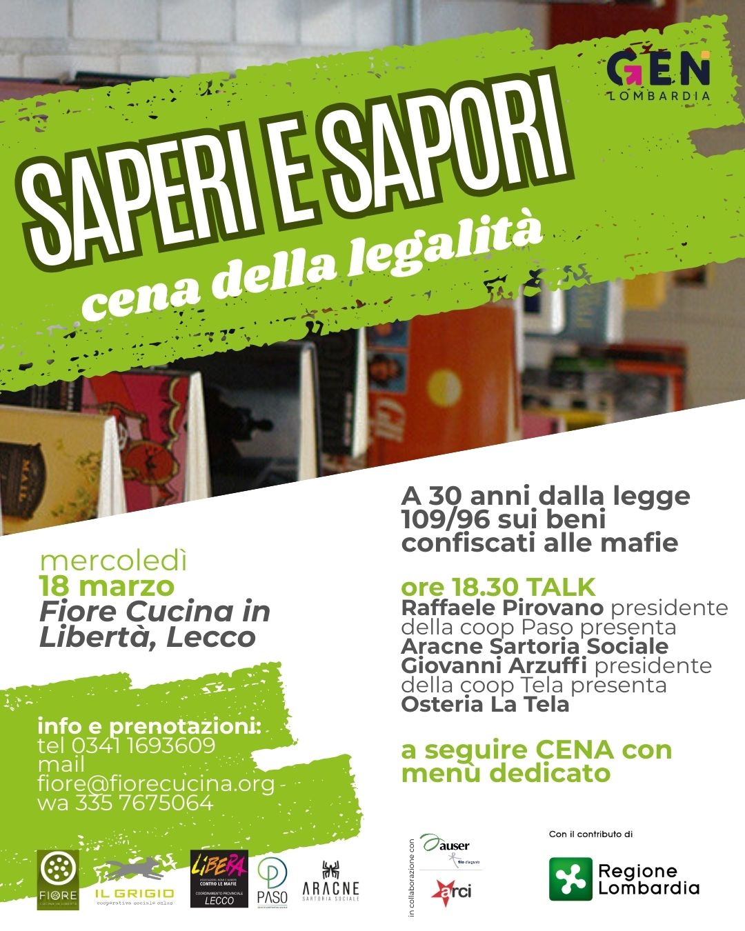 Mercoledì 18 marzo 2026 torna la rassegna Saperi e Sapori, promossa da Libera Lombardia in collaborazione con il Ristorante Pizzeria Fiore Cucina in Libertà di Lecco e la cooperativa Il Grigio. L’evento celebra i 30 anni della legge 109/96 sul riutilizzo pubblico dei beni confiscati alle mafie, raccontando due importanti realtà locali: Aracne Sartoria Sociale e Osteria La Tela.