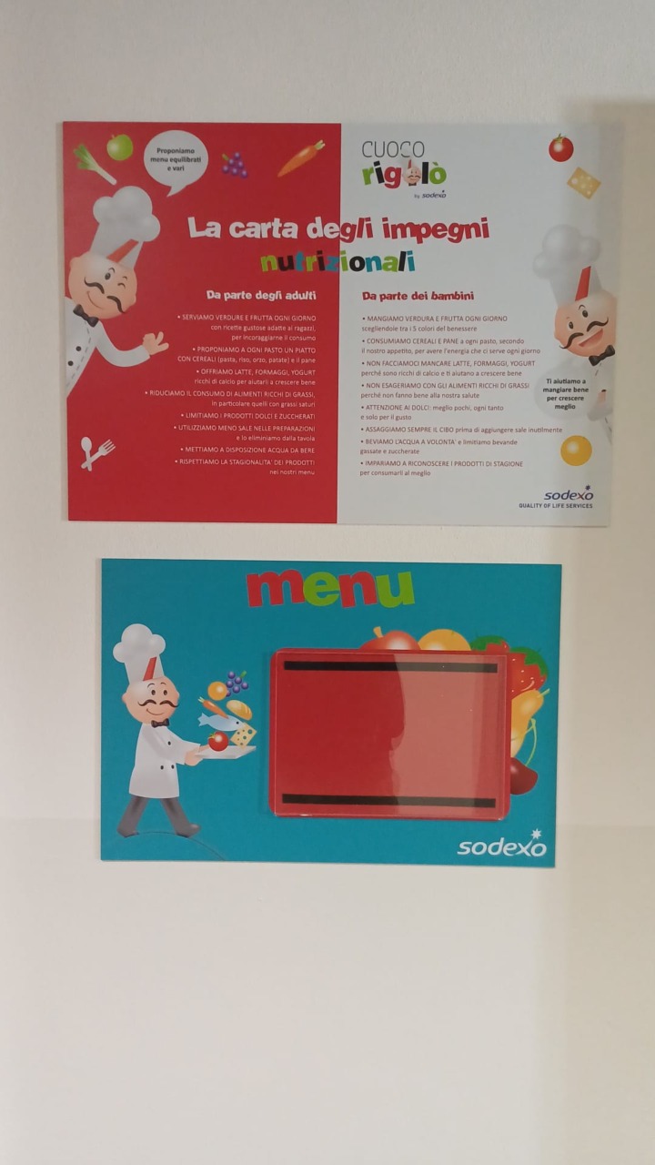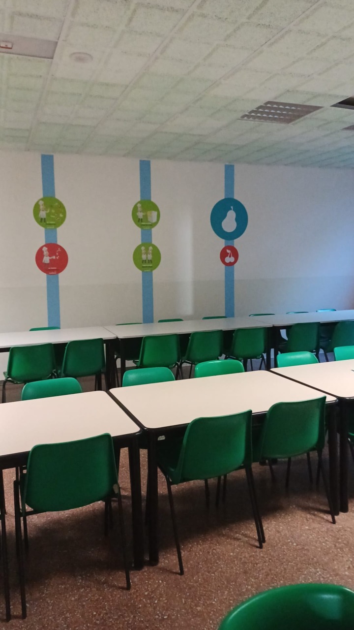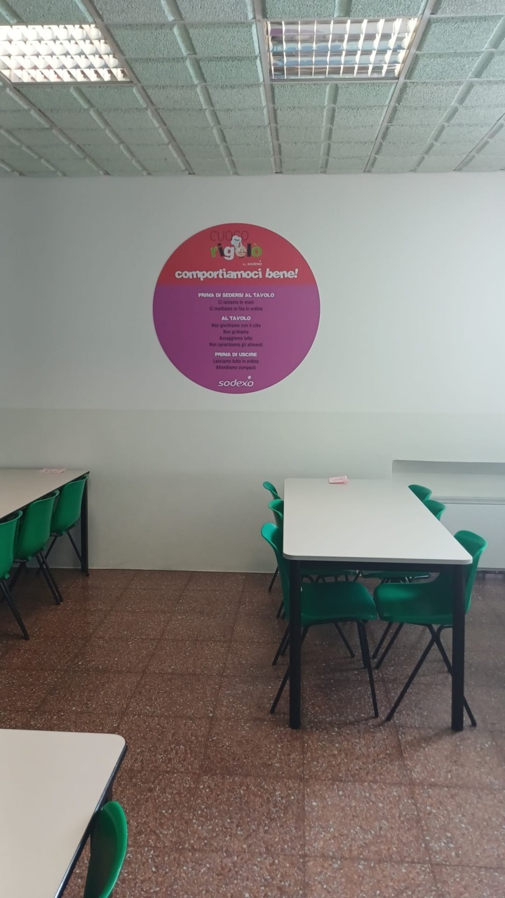 I lavori, per un costo complessivo di 30.988,80 euro (Iva compresa), sono stati completati successivamente, per quanto riguarda il refettorio, dall’allestimento realizzato dalla ditta Sodexo con grandi adesivi colorati che hanno come protagonista il “Cuoco Rigolò”. Oltre a rendere l’ambiente più gradevole e allegro, questi cartelli, con semplici indicazioni in tema di educazione alimentare e suggerimenti per un comportamento educato e rispettoso a tavola, hanno anche una funzione educativa.