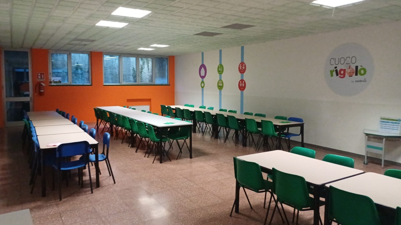 Valmadrera, la mensa della scuola Leopardi ha un nuovo look: pareti colorate e pannelli informativi