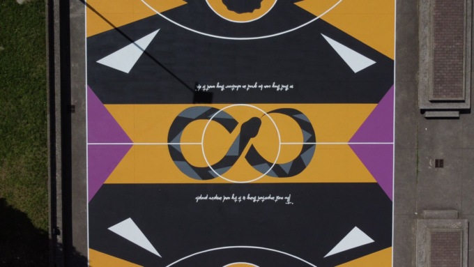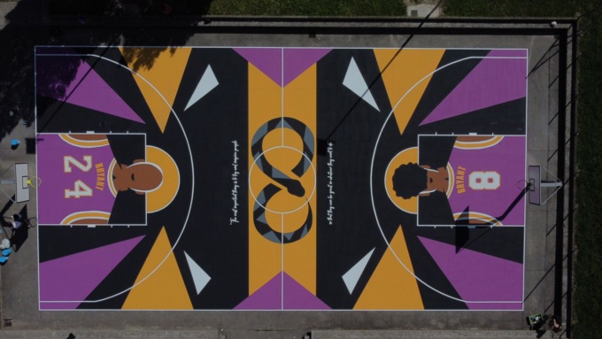 Al centro del campo un serpente (dal soprannome Black Mamba) attorcigliato a formare un infinito: rappresenta la tenacia, la dedizione e l’impegno di Kobe, valori che trascendono il basket.