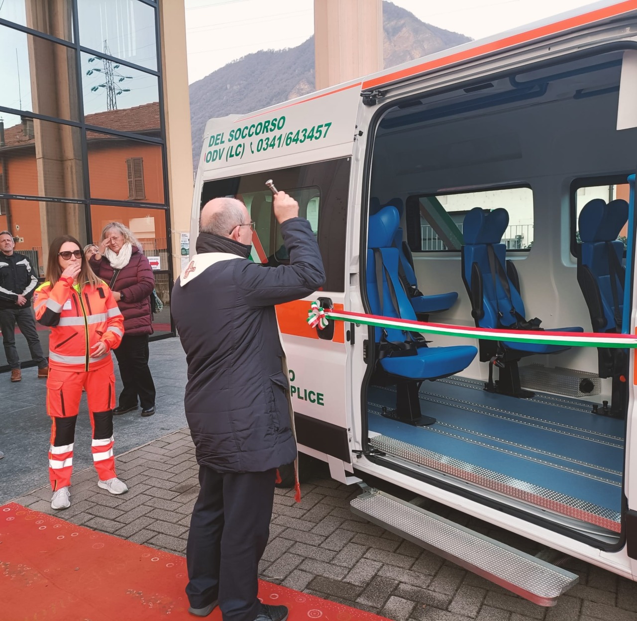 A benedire il nuovo mezzo di trasporto, l’arciprete di Calolziocorte, don Antonio Vitali. Presenti all’inaugurazione il sindaco di Airuno, Gianfranco Lavelli, il vice di Calolzio Aldo Valsecchi, il sindaco di Valgreghentino Matteo Colombo, il sindaco di Carenno Luca Pigazzini e il vice di Vercurago Carlo Greppi.
