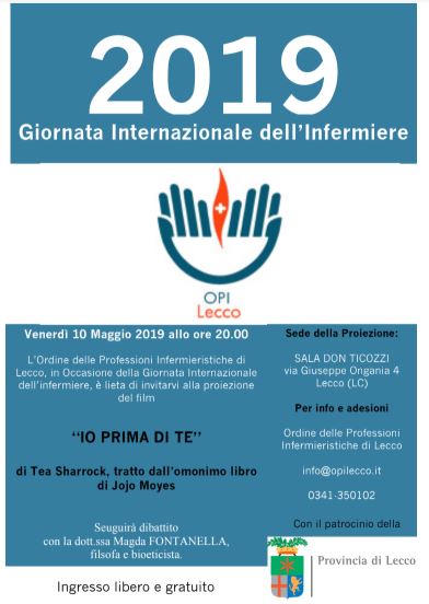 Venerdì 10 Maggio l’OPI è lieto di invitare la cittadinanza e i colleghi al Cineforum, organizzato con il Patrocinio della Provincia di Lecco, che si terrà presso la Sala Don Ticozzi, in via Giuseppe Ongania 4 a Lecco a partire dalle ore 20. A seguito della proiezione del film “Io prima di te” di Tea Sharrok, vi sarà un dibattito a cui parteciperà la Dott.ssa Magda Fontanella, filosofa e bioeticista.