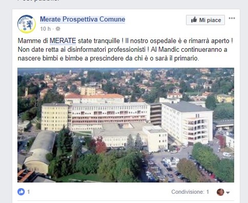 “Mamme di MERATE state tranquille! Il nostro ospedale è e rimarrà aperto ! Non date retta ai disinformatori professionisti ! Al Mandic continueranno a nascere bimbi e bimbe a prescindere da chi è o sarà il primario”. Così si legge sulla pagina Facebook del gruppo. Una presa di posizione che ha scatenato reazioni di dissenso. Ai più è parsa come il tentativo di giustificare l’operato politico dei vertici dell’Asst di Lecco e dell’Ats Brianza. Fatto sta che stamattina il post è stato cancellato.