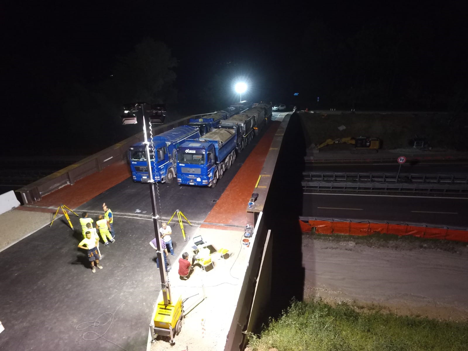 I test sono stati condotti mediante lo stazionamento sulla carreggiata di 8 camion del peso di 45 tonnellate ciascuno mentre le contestuali misurazioni di precisione sono state eseguite tramite apparecchiature topografiche. La sottostante statale 36, temporaneamente interdetta al transito in via precauzionale per il tempo necessario all’esecuzione delle prove, è stata riaperta regolarmente nei tempi previsti.