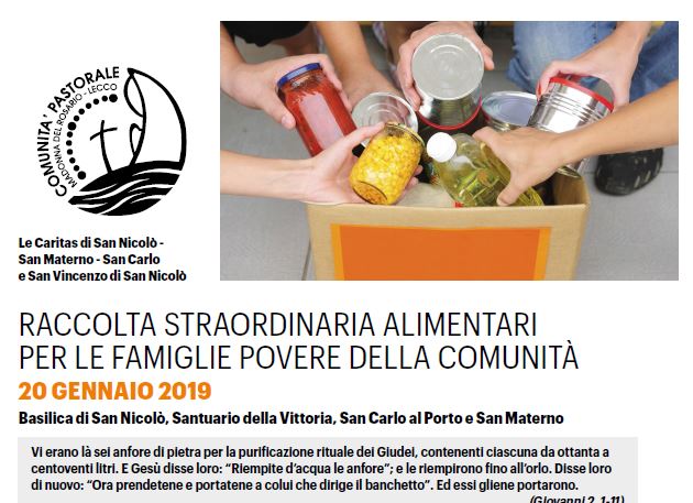 L’iniziativa prevede la raccolta di beni alimentari di lunga conservazione, che verranno raccolti nella Basilica di San Nicolò, al Santuario della Vittoria, San Carlo al Porto e San Materno a Pescarenico durante le celebrazioni delle Sante Messe di domenica 20 gennaio 2019 comprese quelle vigiliari del sabato. Ogni famiglia potrà depositare il proprio contributo all’entrata della chiesa dove degli incaricati provvederanno al ritiro e alla conservazione. E’ possibile anche “dare una mano” durante la giornata. “Anche il contributo con la presenza per il ritiro degli alimenti e la loro sistemazione sarà ben accetto (è possibile dare nome agli incaricati Caritas o alle rispettive parrocchie).