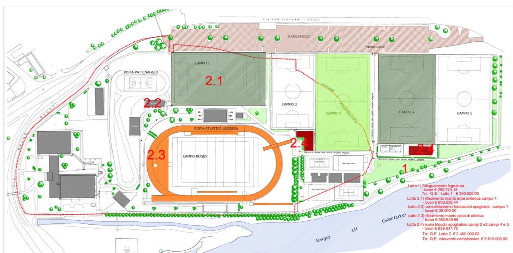 Gli interventi riguardano due lotti esterni. Il primo dovrebbe partire subito, nel periodo di chiusura del centro per le feste e riguarda il rifacimento della rete fognaria. Partner Lario Reti Holding. Importo dei lavori è di 350mila euro. Subito dopo seguirà il secondo lotto, articolato in quattro distinte opere: il rifacimento del manto erboso del campo da calcio numero uno (sarà messo il sintetico) per 630mila euro; il consolidamento delle fondamenta del vicino spogliatoio (35mila euro); la costruzione ex novo di due nuovi blocchi di spogliatoi a servizio dei campi numero 2, 3 e 4 (840mila euro); il rifacimento del manto della pista di atletica (360mila euro).