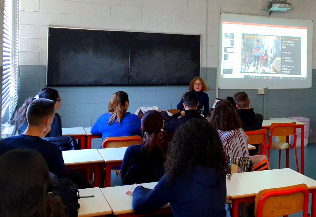Claudia Molteni-Ryan ha affrontato, anche attraverso un excursus storico la questione siriana. Avvalendosi di un breve filmato creato dal Corriere della Sera ha spiegato perché inizia la guerra e le tappe fondamentali della stessa che vedono quali parti in causa l’Esercito regolare siriano, l’ Esercito Siriano Libero,il Fronte Al-Nusra,l’ ISIS, i Curdi. La docente ha illustrato gli ultimi sviluppi con lo spostamento dei soldati americani dal confine con la Turchia e il conseguente ingresso delle truppe e milizie di Erdogan oltre il confine siriano e l’occupazione di parte del Rojava, le implicazioni politiche, l’imbarazzo dell’ONU. L’appoggio della Russia e dell’Iran ad Assad. In particolare è stato approfondito il ruolo dei curdi e delle soldatesse dell’Ypj (Unità per la protezione delle donne) che combattono in prima linea.