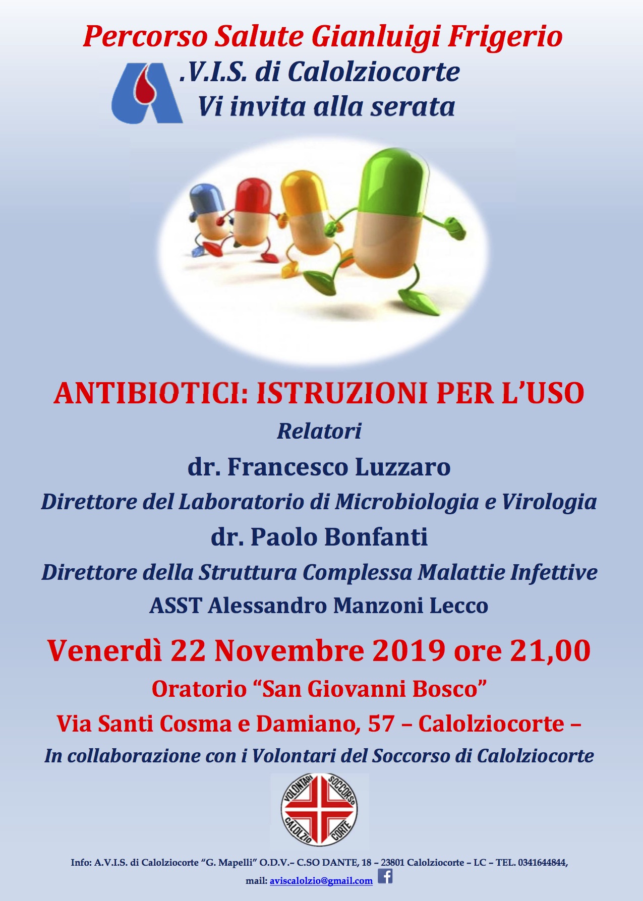La serata avrà come tematica l’uso degli antibiotici. I relatori saranno il dottor Francesco Luzzaro, direttore di Microbiologia e Virologia; e il dottore Paolo Bonfanti, direttore della Struttura Complessa di Malattie Infettive, entrambi operativi presso l’ASST Alessandro Manzoni di Lecco. La serata dal titolo “Antibiotici: Uso e Abuso” è promossa anche per ricordare la “Giornata europea degli antibiotici” del 18 novembre 2019, che ha come obiettivo la sensibilizzazione sulla minaccia rappresentata dalla resistenza agli antibiotici, nonché sull’uso prudente degli antibiotici stessi.