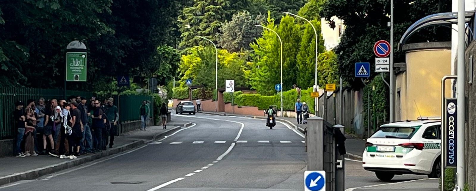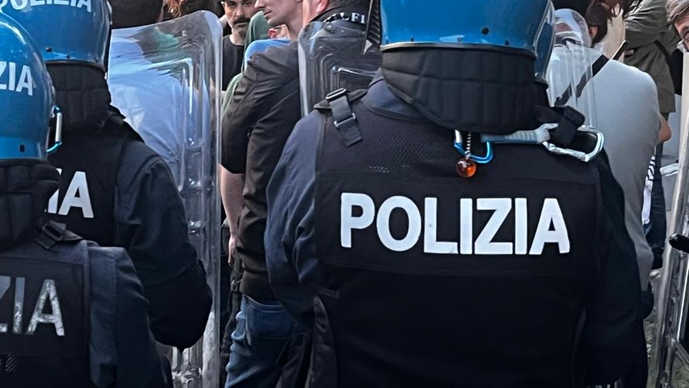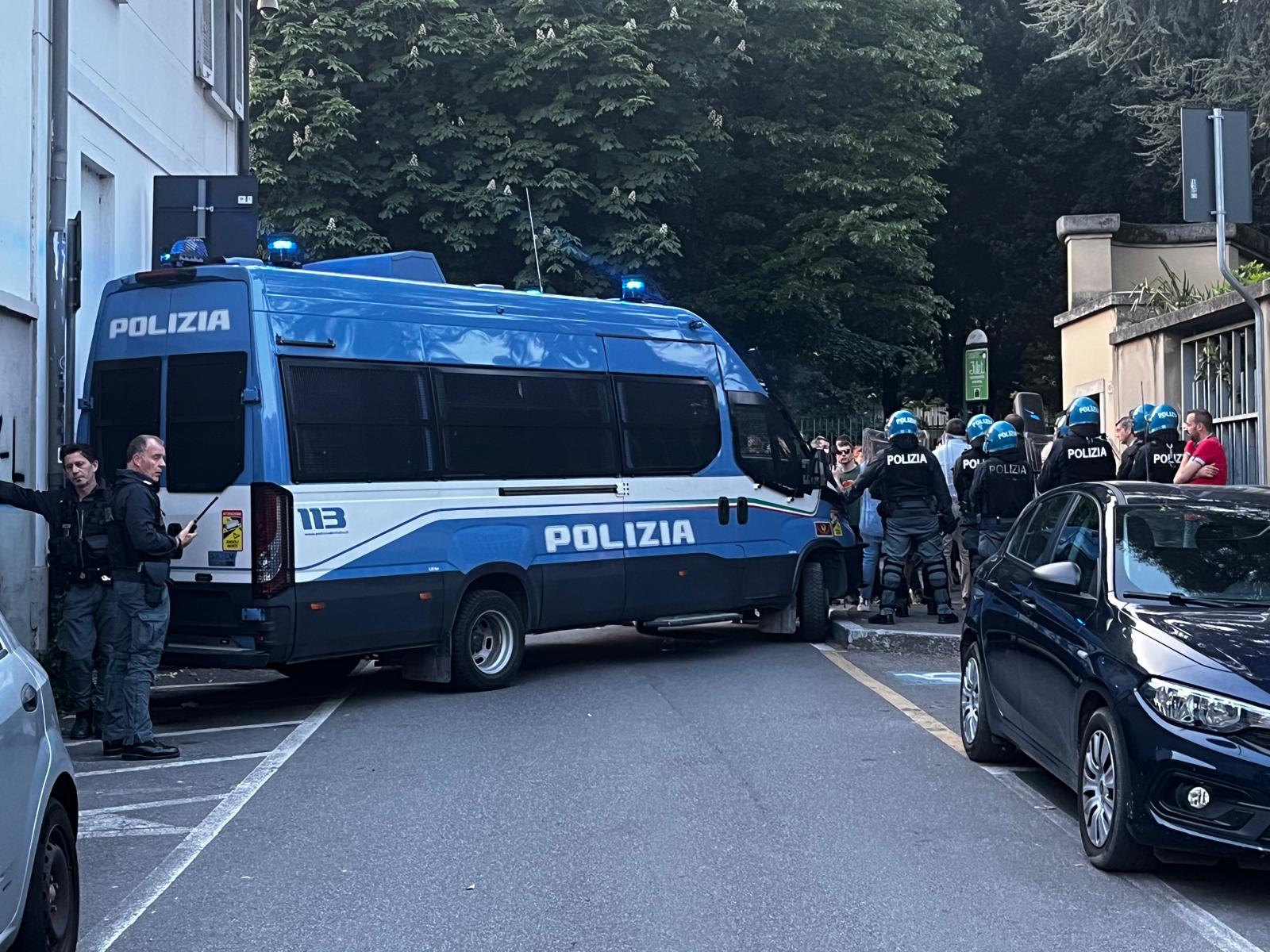 Gli uomini e le donne della Questura, schierati su entrambi gli sbocchi di via Pascoli, ma anche in via Cantarelli e alla rotonda sotto via don Pozzi, hanno impedito qualsiasi tipo di contatto (sonoro a parte, visto che i cori si sono uditi distintamente) tra contestatori e manifestanti. Una ventina questi ultimi, che dopo aver camminato in corteo lungo via Cantarelli, con le bandiere tricolori alzate si sono ritrovati davanti alla lapide di via Pascoli. Anzi, davanti alle “lapidi”.