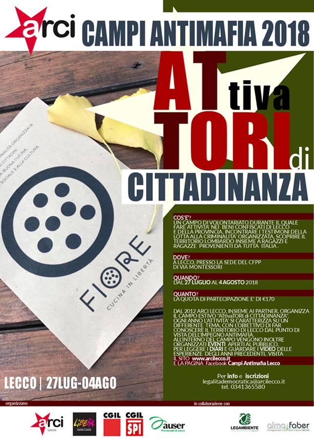 Anche quest’anno Arci Lecco, insieme a Libera Lecco, Auser Volontariato Lecco, Cgil Lecco, Spi Cgil Lecco e in collaborazione con Legambiente Lecco Onlus e AlmaFaber organizza dal 27 luglio al 4 agosto il campo antimafia “ATtivaTORI di Cittadinanza”.