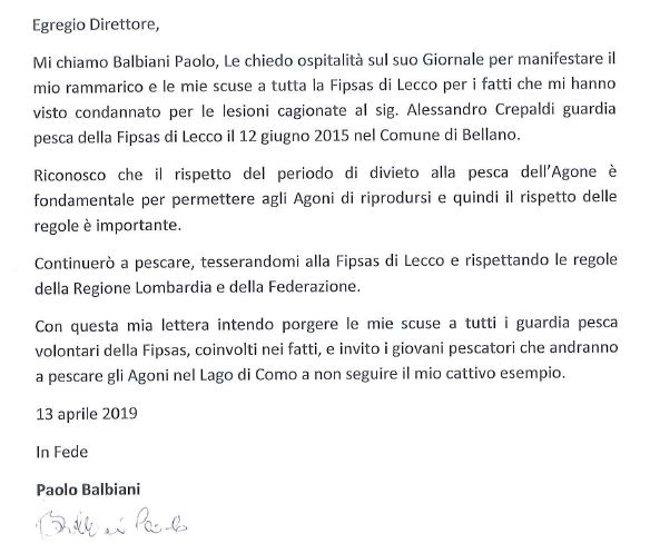 In tale contesto di contenimento e contrasto del bracconaggio ittico la Fipsas evidenziale scuse formulate dal sig. Paolo Balbiani già condannato dal Tribunale di Lecco per i fatti del 12 maggio 2015 (un guardia pesca veniva percosso con un bastone)