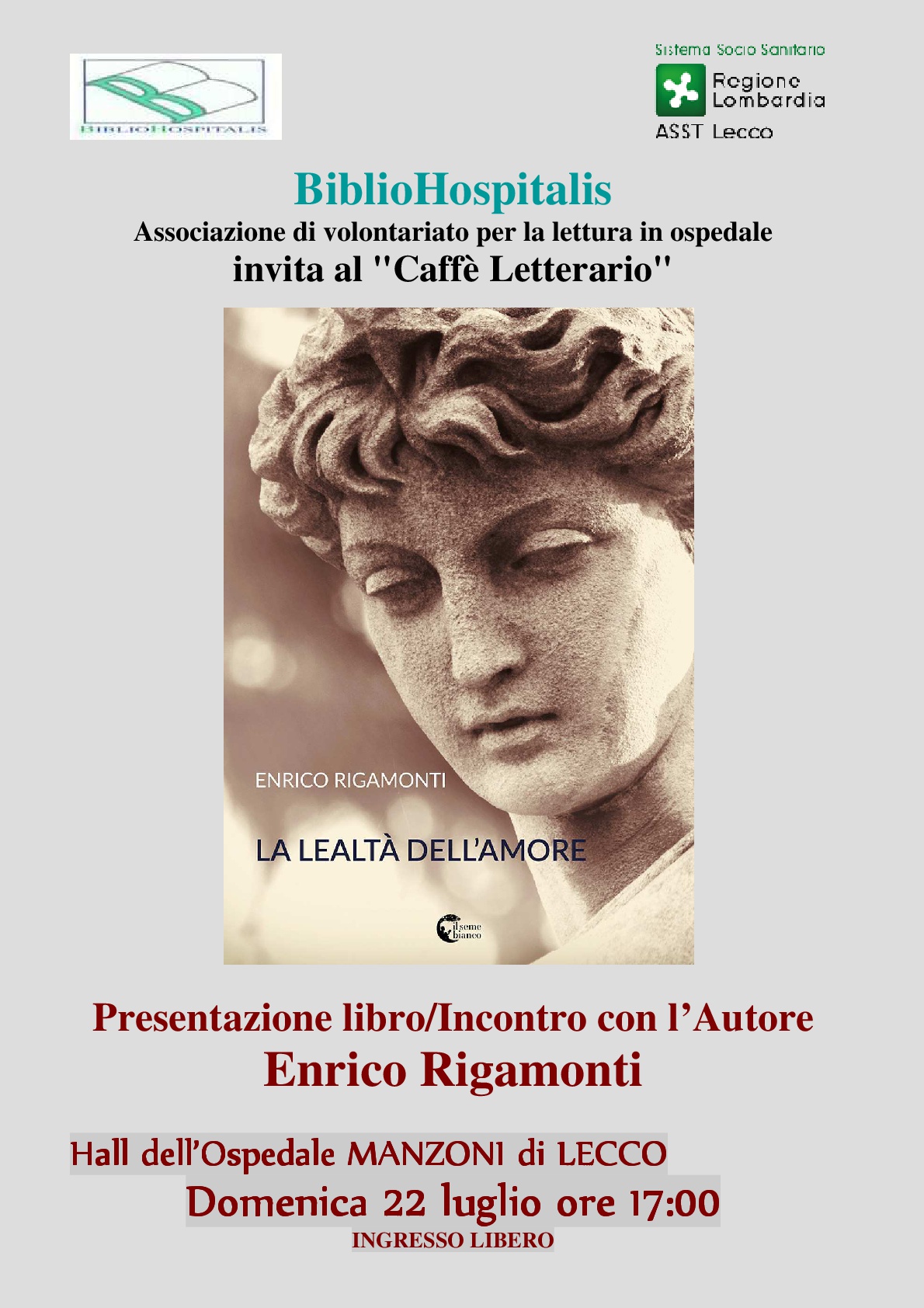 Domenica 22 luglio alle 17, nell’ambito delle attività della Biblioteca per degenti dell’ospedale A.Manzoni di Lecco, è programmato un evento culturale che vedrà come ospite Enrico Rigamonti , autore conosciuto a livello locale e non solo, che presenterà il suo ultimo libro “La lealtà dell’amore”.