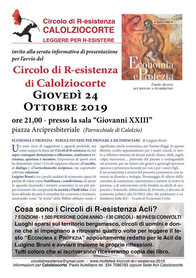 La serata informativa, con invito aperto, per presentare e organizzare il Circolo calolziese, con la collaborazione delle Acli di Calolziocorte, è in programma giovedì 24 ottobre, alle 21, nella sala “Giovanni XXIII” – piazza Arcipresbiteriale (Parrocchiale di Calolzio). Parteciperanno alcuni giovani delle Acli di Bergamo per introdurre il tema di quest’anno e illustrare lo svolgimento dell’iniziativa, attorno alla lettura del testo “Economia e profezia” redatto da Luigino Bruni appositamente per le Acli.